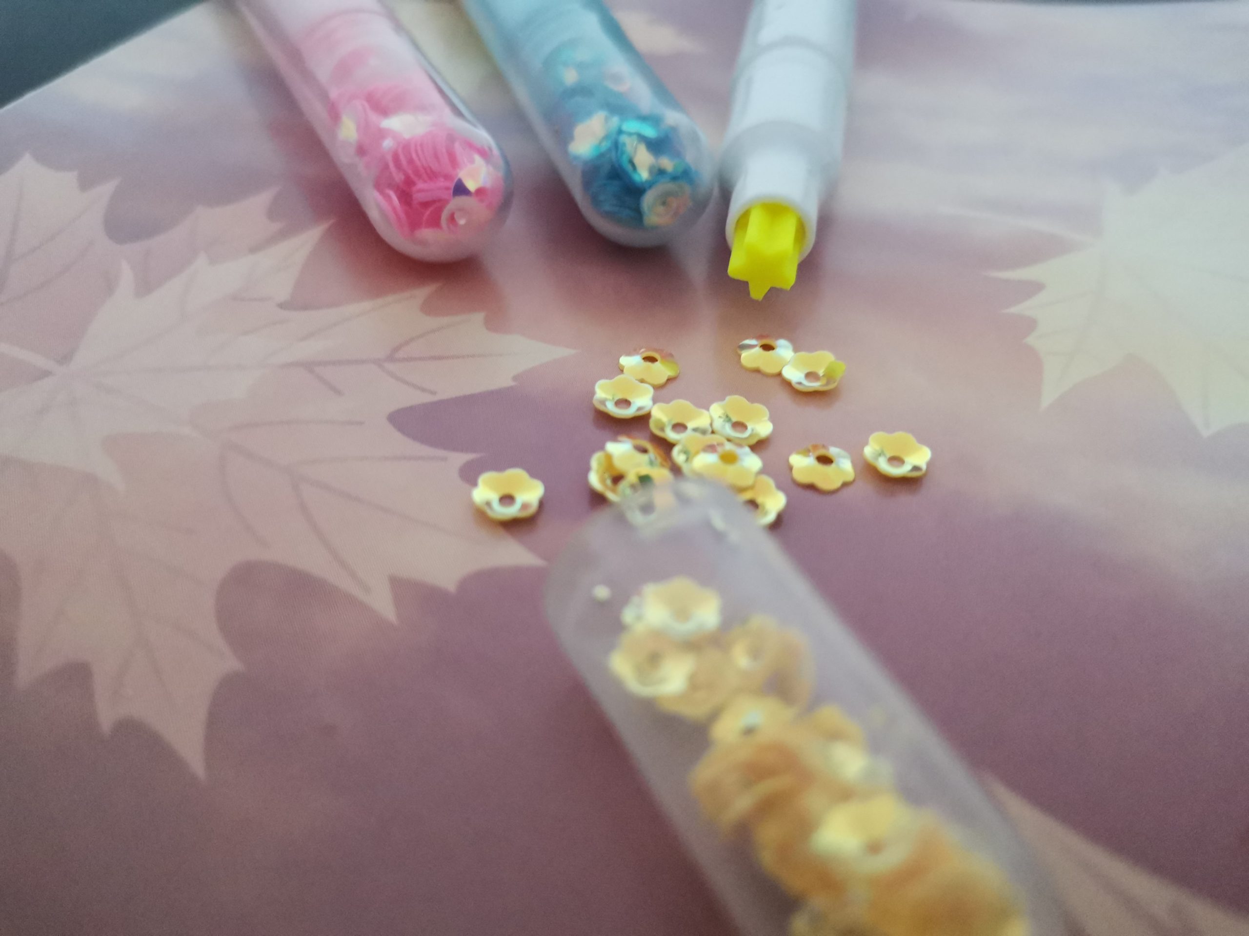 - Trois feutres fluo à la mine en forme d’étoile (un bleu, un rose et un jaune) dont le bouchon contient des paillettes
