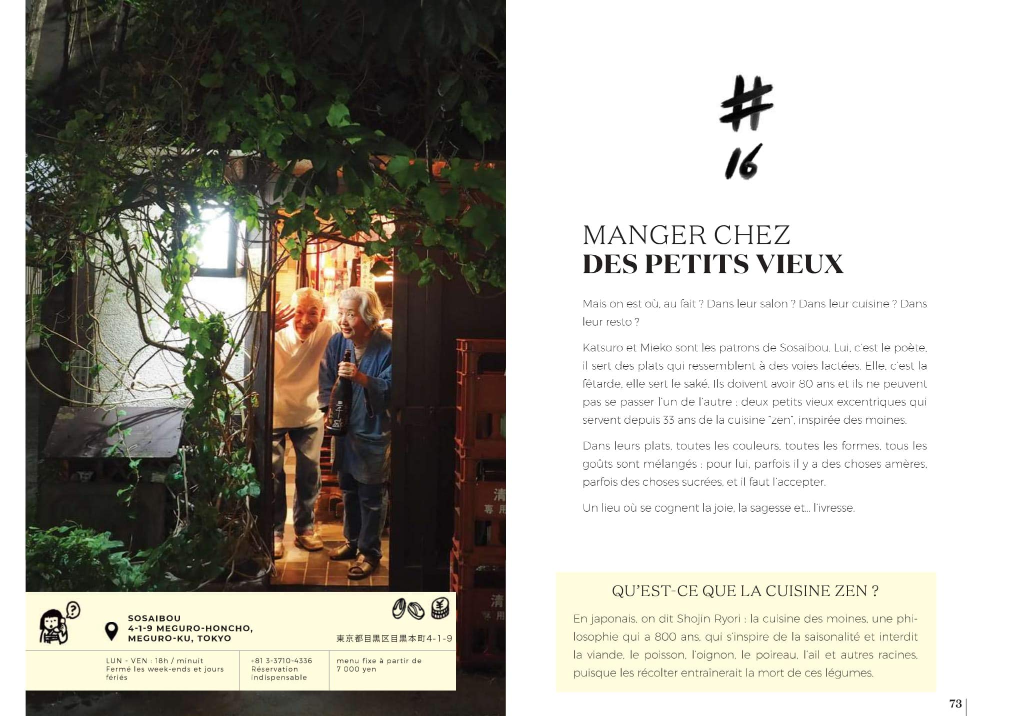 Avec sa belle couverture et ses très nombreuses photos, c’est un guide qui se lit comme une succession de petites histoires, des plongées dans des lieux inédits et fascinants. Il y en a pour tous les goûts : salon de thé au milieu des fleurs, onsen, déjeuner dans un jardin japonais, street-food, head spa, nuit dans un hôtel capsule ou parmi les livres, jus de yuzu au musée Nezu, et bien d’autres choses encore.