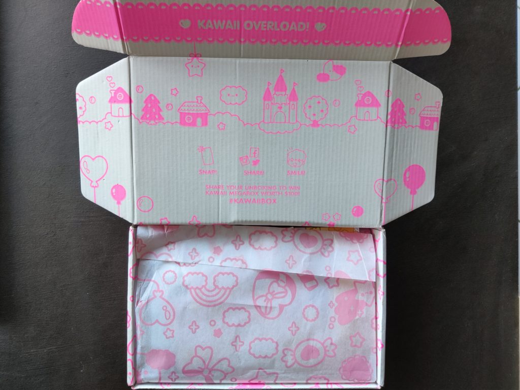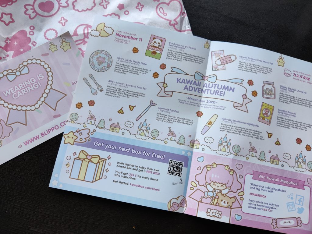 Pour ma part, j’ai reçu la box de novembre qui était sur le thème de l’automne. Celle-ci contenait 8 objets variés, dans des tons pastels rosés et bleutés. La décoration est pensée jusqu’à l’emballage en carton agrémenté de petits dessins mignons roses. Il est également précisé qu’en partageant son unboxing et en utilisant le hashtag #kawaiibox, il est possible de gagner une box d’une valeur de 100$. Bref, sans plus attendre, le contenu :
