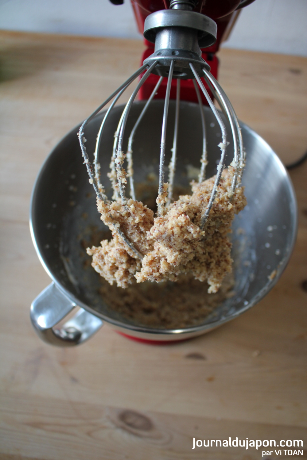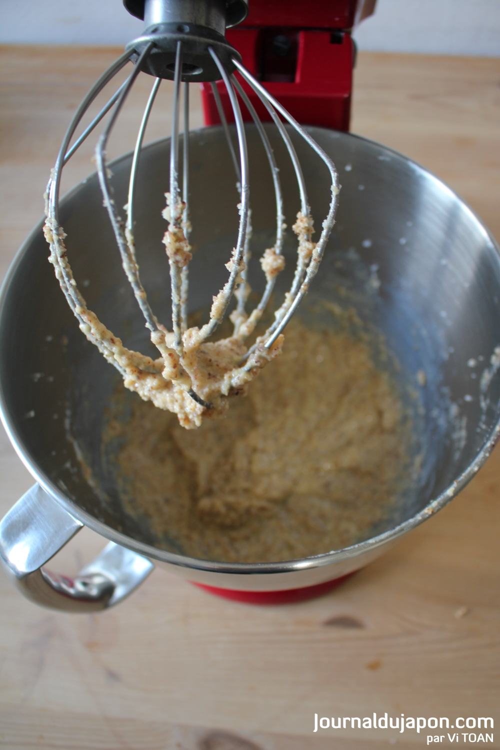 – Fouettez votre beurre mou, coupé en morceaux, pour lui donner une texture pommade. Ajoutez-y le sucre, puis la poudre d’amande, les œufs, et enfin la pâte de haricots Azuki. Voilà, votre crème d’amande est prête.