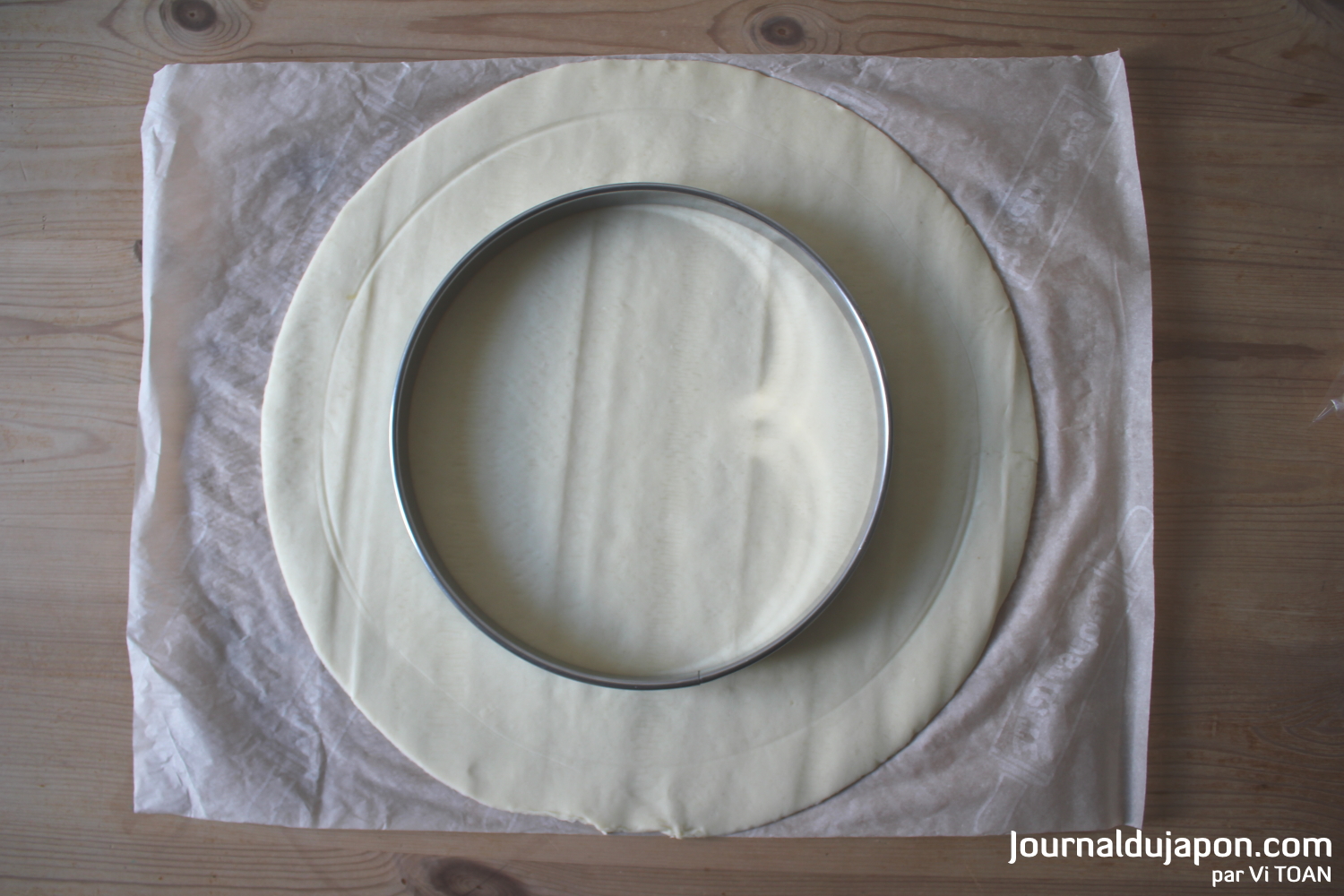 – Sortez une première pâte feuilletée, et faites deux marques légères avec des moules ou cercles à tartes, ou simplement avec votre ongle. Le plus petit cercle vous servira de guide pour mettre votre garniture, et le second indiquera la marge nécessaire pour refermer votre galette et couper l’excédent de pâte.