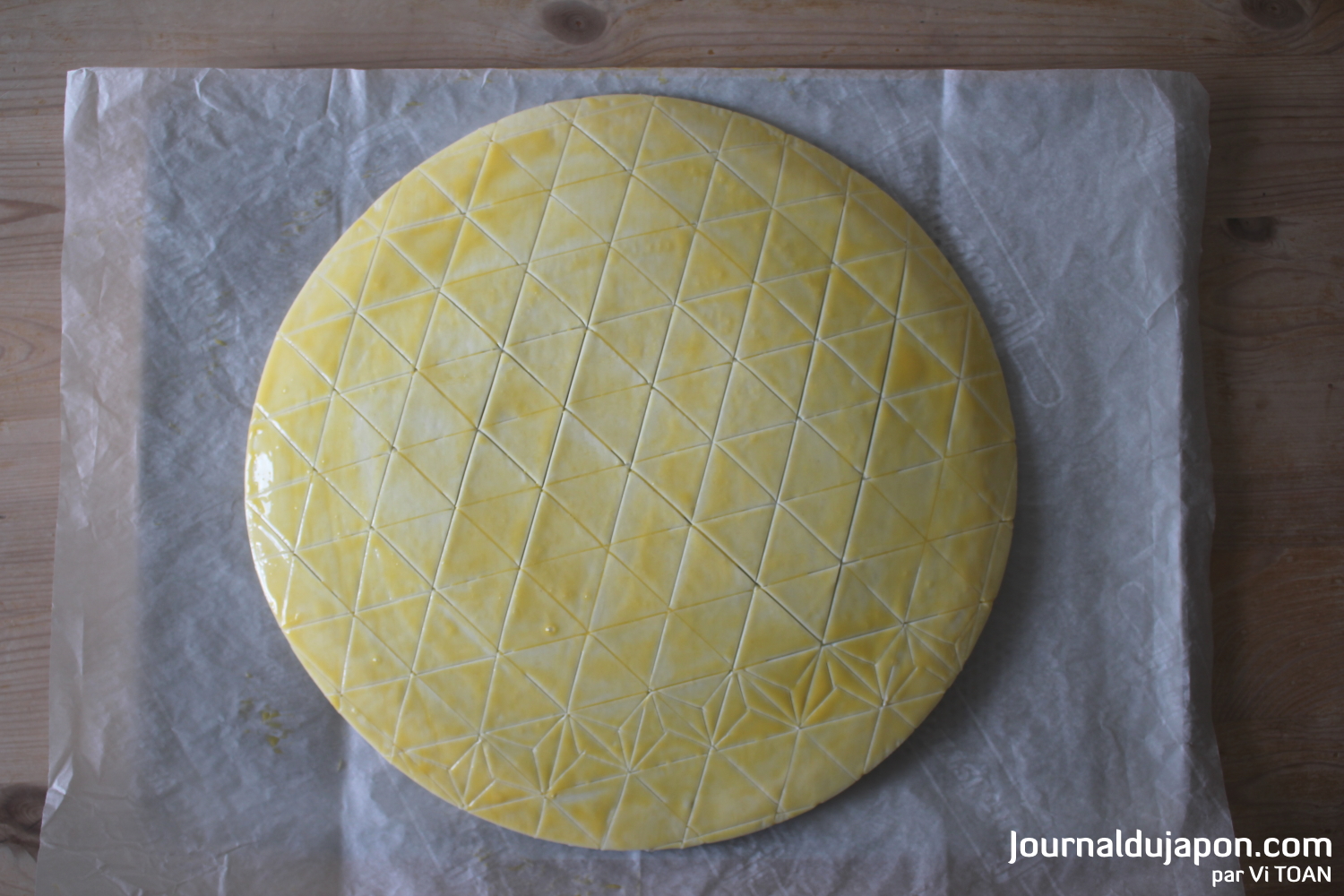 Pour notre part, nous avons placé notre galette au congélateur pendant quelques heures afin de la faire durcir, et d’avoir une surface plane en la retournant. Des pâtissiers comme Cédric Grolet se servent de cette méthode. Nous avons fait un motif japonais appelé Asanoha en nous servant d’une longue règle en fer. Les motifs géométriques donneront une touche moderne à votre galette.