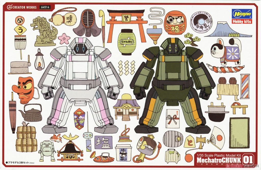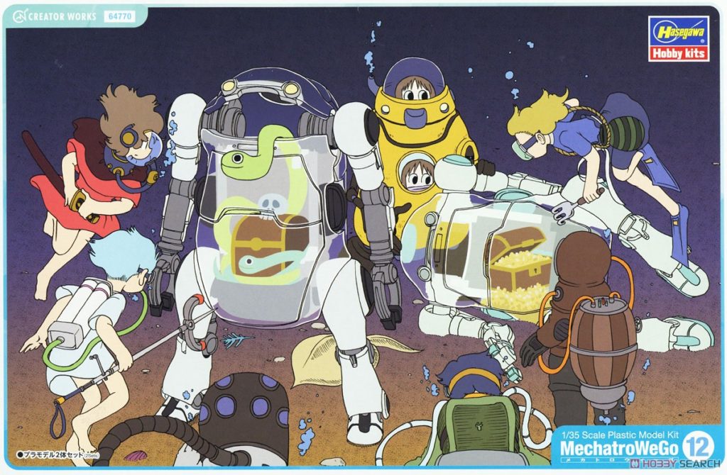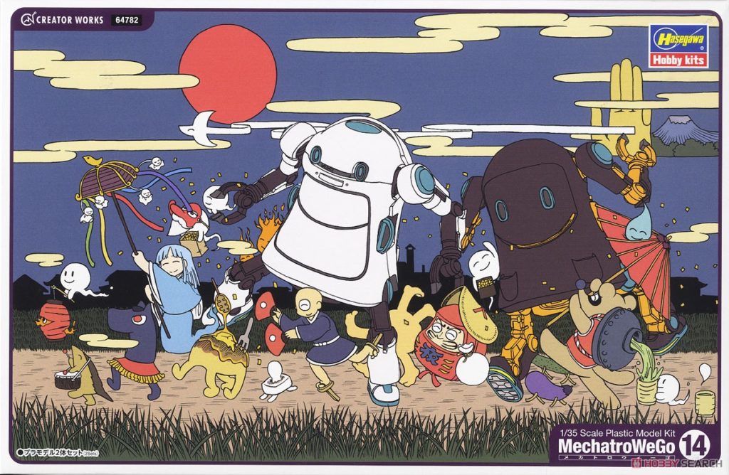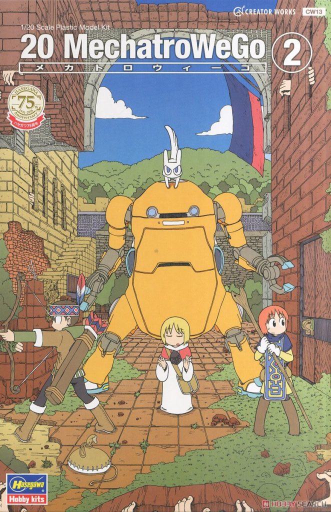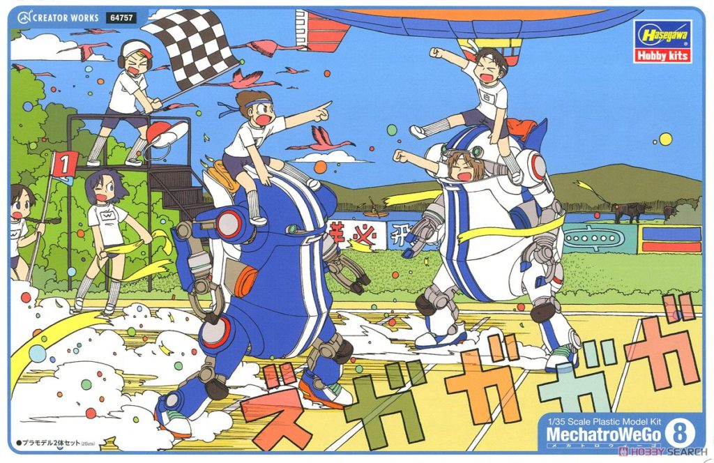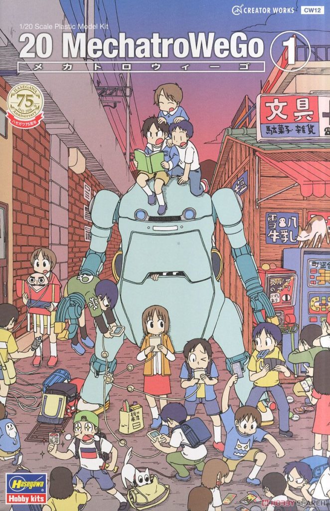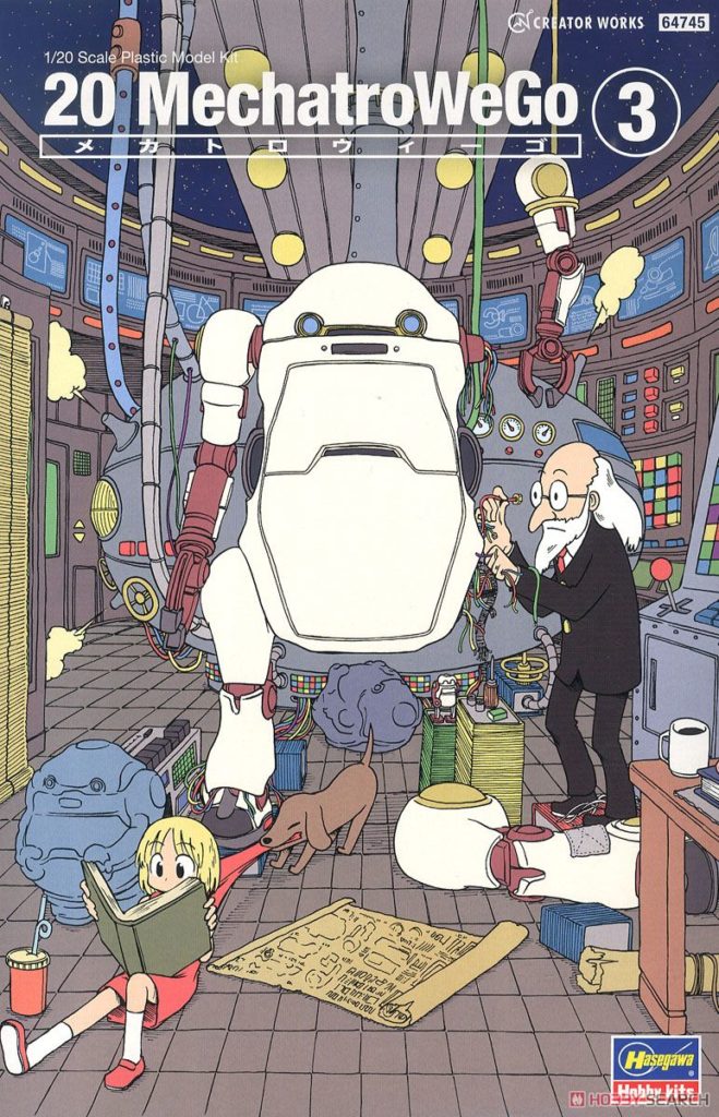 Retour au monde réel. Le Mechatro Wego a fait son petit bonhomme de chemin depuis sa première commercialisation en 2011. Chubu Mechatronics, fort de son succès, ne s’est alors pas limitée à une seule gamme. En plus des modèles de base avec des articulations en métal se sont développés des kits en plastique plus accessibles aux enfants ou aux débutants, ainsi que des modèles de différentes tailles et de couleurs variées (d’où sont issus leur nom dans un premier temps comme Mizuiro, Purple). On peut d’ailleurs remercier grandement Keiichi ARAWI pour les illustrations de couverture des boîtes de chez Hasegawa Hobby Kit, son style kawaii facilement identifiable (il est à l’origine du manga Nichijou, adapté par Kyoto Animation en 2011) rajoute une dose adorable aux machines en les mettant en scène dans des cadres surchargés respirant la vie et la bonne humeur.