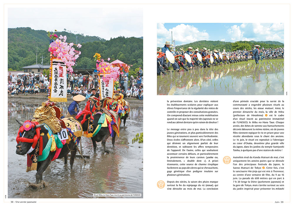 En juin, c’est le début de la saison des pluies. Le premier dimanche du mois, on se retrouve dans la préfecture d’Hiroshima, et plus précisément dans la ville de Mibu, pour assister au Mibu no Hana Taue. Pendant ce rituel inscrit au patrimoine immatériel de l’UNESCO, on laboure la rizière « où de jeunes femmes viennent repiquer le riz en priant pour une récolte abondante sous le chant des anciens ».