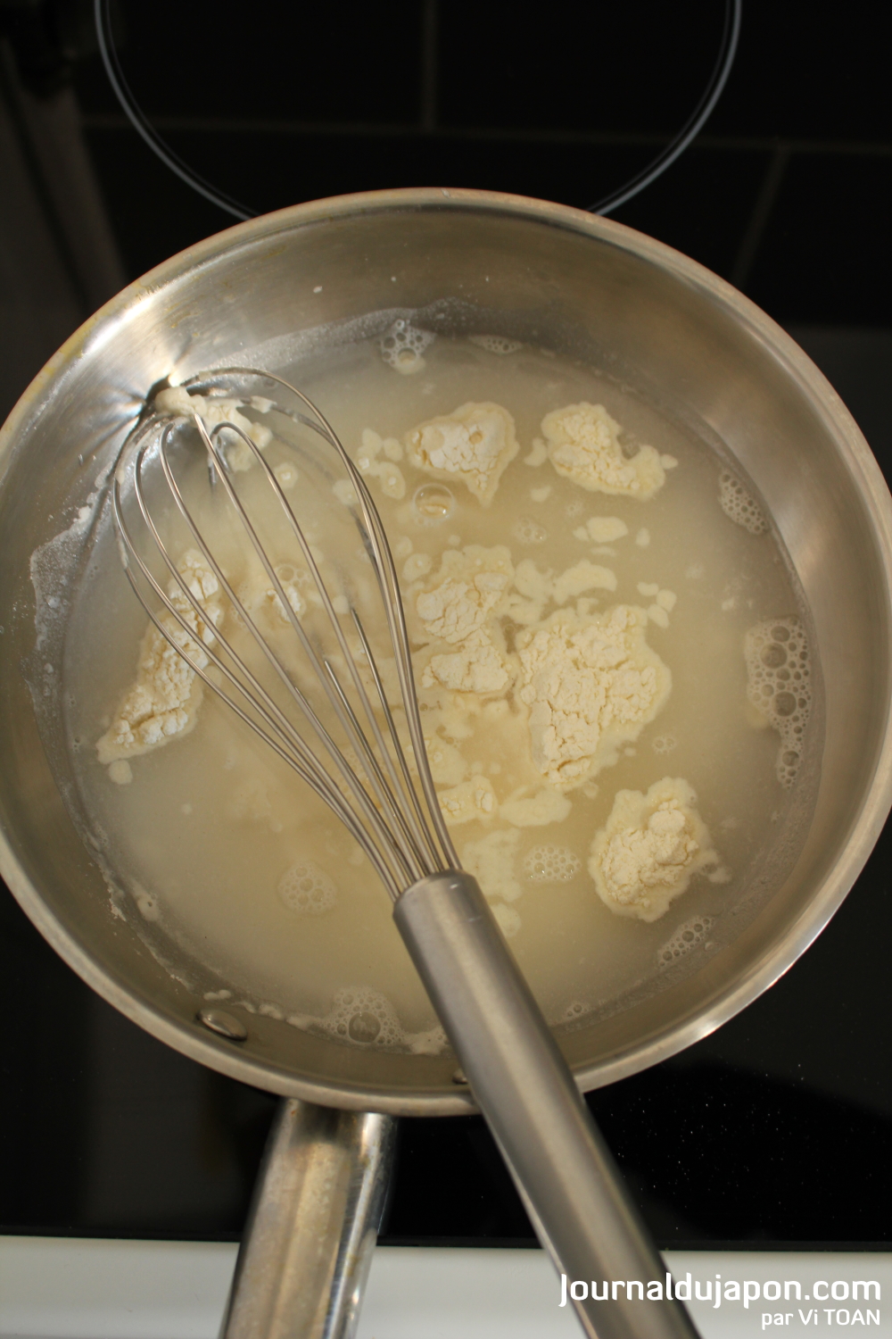 – Dans une poêle, faites dissoudre la farine dans l’eau à l’aide d’un fouet, puis commencez la cuisson à feu moyen.