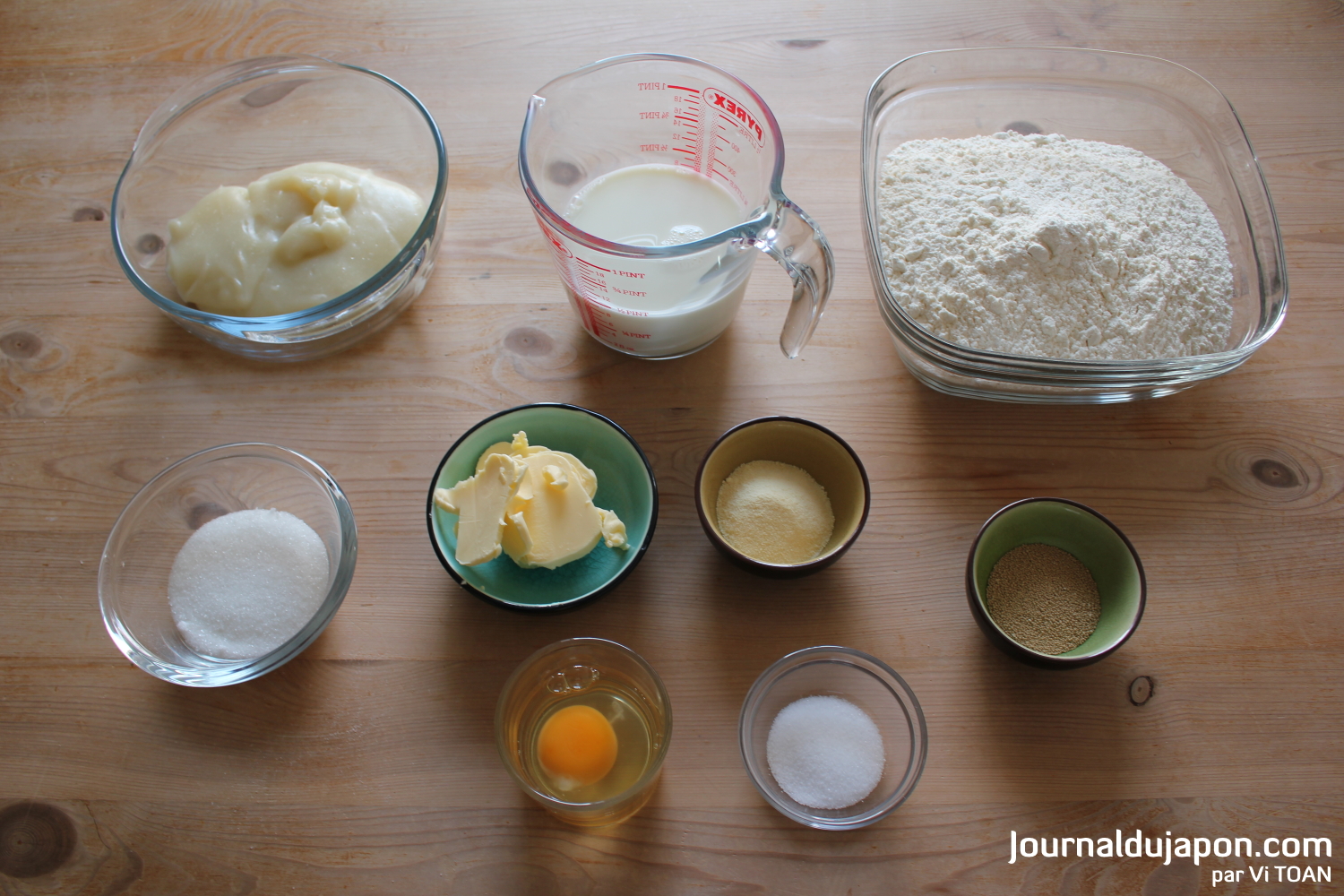 – Mélangez les ingrédients secs dans un bol, et ajoutez la moitié de l’œuf battu et le Tangzhong.