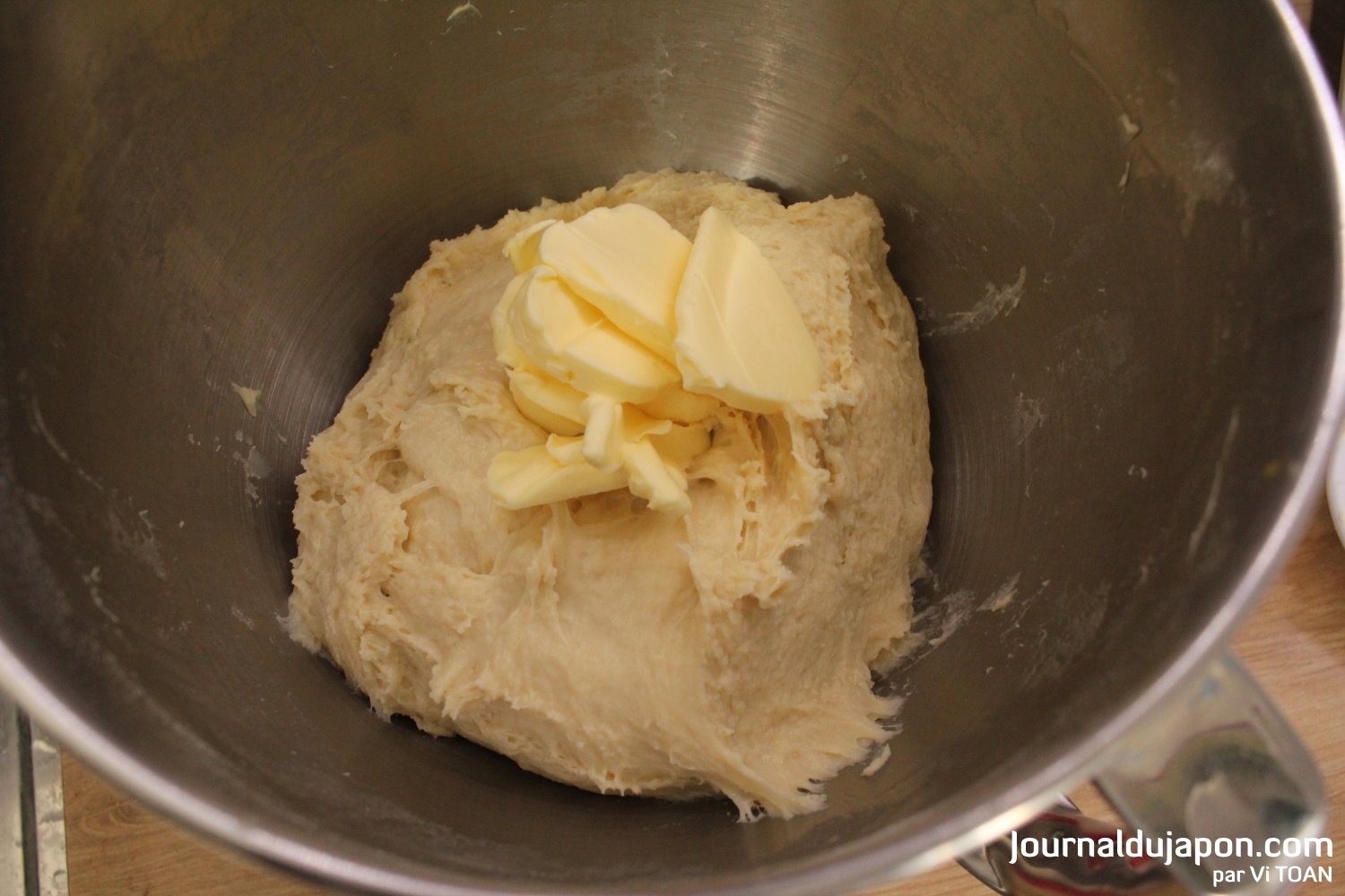 – Ajoutez le beurre (que vous aurez sorti en avance pour qu’il ait une texture pommade) et pétrissez jusqu’à ce que la préparation ne colle plus aux parois.