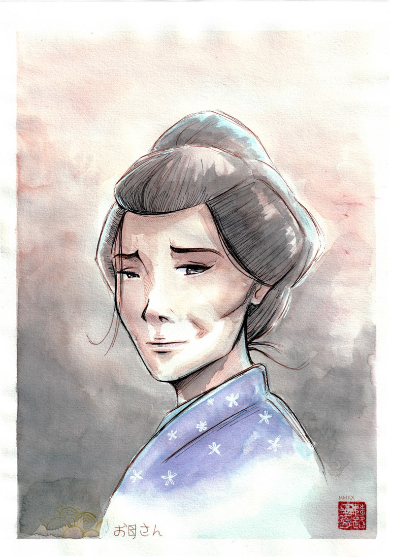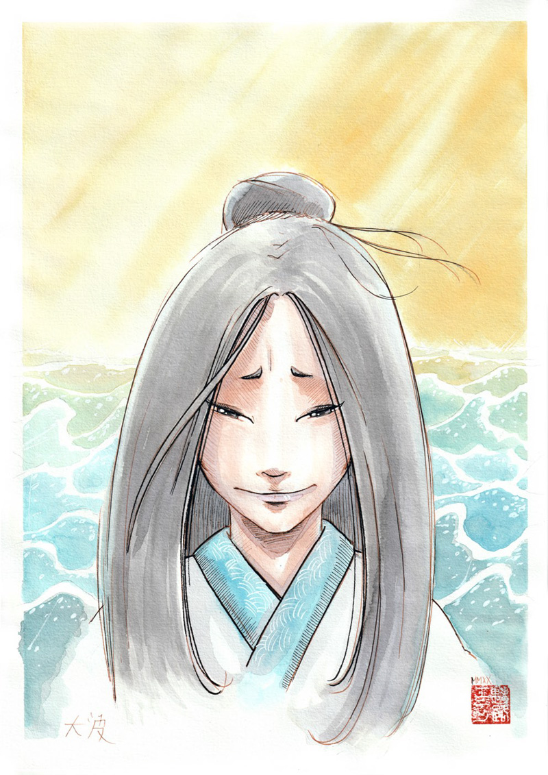 Je trouve très touchante la ferveur avec laquelle les personnages principaux prient pour avoir un enfant à aimer et à élever. Jeune papa, je me suis senti très proche de ces personnages. Ce personnage d’Ônami par son caractère et la représentation atypique qui en est faite dans ce conte, m’ont aussi rappelé la princesse Kaguya. J’avais envie moi aussi, par mon admiration et mon respect pour le travail d’Isao Takahata, de représenter ce personnage à ma manière.