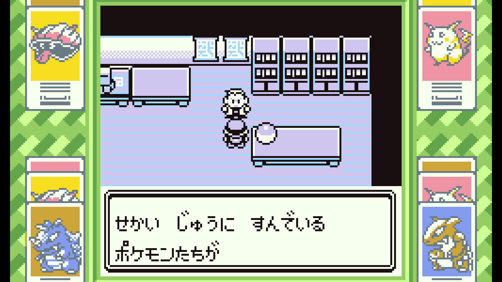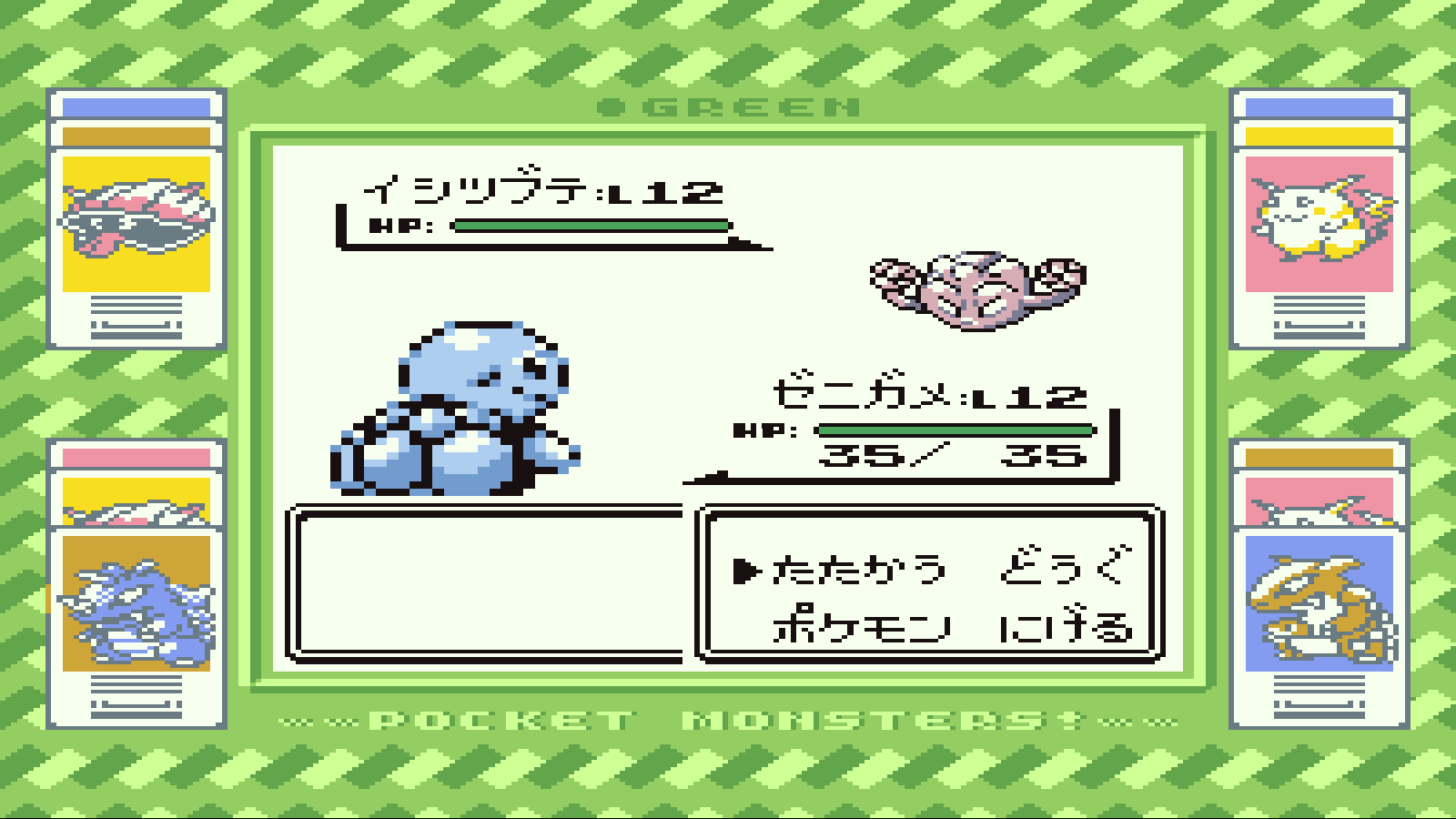 Il est à noter, donc, que les couleurs d’origine du premier jeu Pokémon sont « Rouge » et « Vert ». La Bleue arrivera plus tard, comportant des corrections par rapport aux précédentes, et sera directement la concurrente de la version Rouge. La Verte, quant à elle, restera un mystère pour les joueurs non-japonais. C’est à partir de cette version (Midori) qu’à été effectué le test ainsi que les captures d’écran (prises à partir d’un Super GameBoy, ce qui explique les contours de l’image).