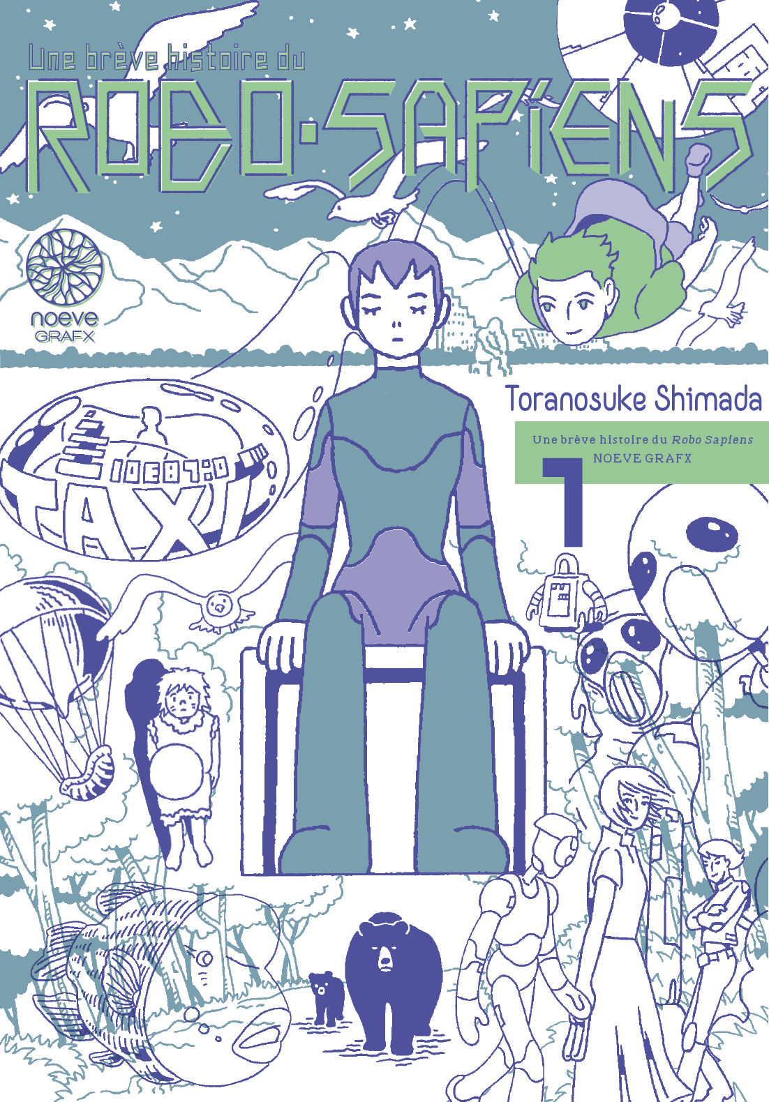 Noeve Grafx, nouvel éditeur de manga et d’artbook arrivé fin 2020, continue de nous surprendre avec une ligne éditoriale très ambivalente. À côté de leur titre « Arty » comme Veil, sort SpeOpe, pure œuvre de SF, sans compter leurs comédies romantiques aux allures un peu friponnes telle que Rent a girlfriend pour ne citer qu’elle. Le titre qui nous intéresse ici a tout l’air de mélanger les deux premières catégories : le côté Arty et la science-fiction. Il s’agit d’Une brève histoire de Robo-Sapiens par Toranosuke SHIMADA. Le style graphique de la couverture attire tout de suite l’œil, la fausse simplicité du trait cache un travail détaillé sur les expressions et les détails des machines et des décors. Le travail sur les contrastes entre les différents aplats de couleurs participe également au charme du dessin.