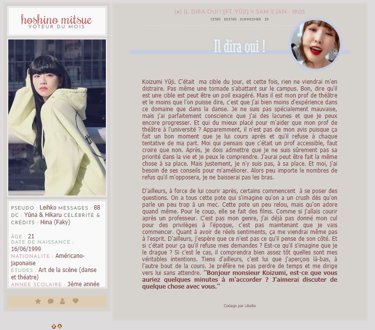 ![]() Un exemple de rp : la réponse au 1er message (post) © discoveRin (texte) |