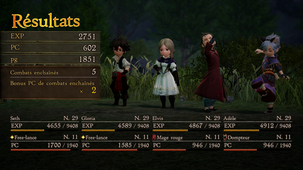 Chaque personnage peut s’attribuer deux classes : une principale et une secondaire. La première définira votre apparence, vos statistiques, et les items dont vous pouvez vous équiper. La secondaire vous permet d’avoir accès aux techniques et magies apprises. Vous pouvez par exemple passer votre héros en Défenseur, et lui donner accès aux magies de soin apprises précédemment avec le Mage Blanc pour vous confectionner un paladin : un tank capable de soigner. Via ces compétences, le jeu dévoile encore plus son potentiel. Lorsque qu’on les ajoute aux effets d’un équipement, du job secondaire ou du Brave et Default, le jeu devient tout de suite plus tactique. De la tactique en préparation avec les compétences, et pendant les combats avec les Brave et Default.