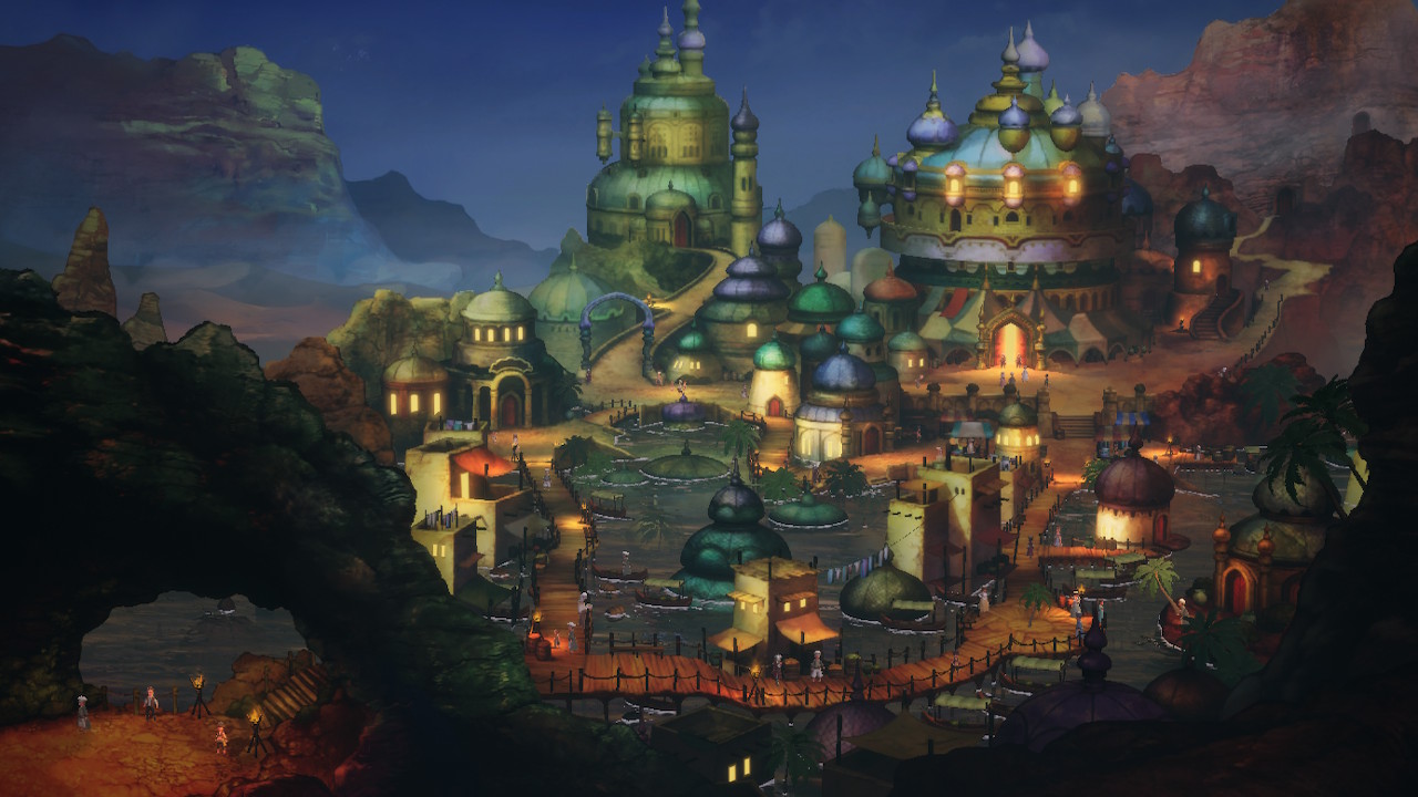 Dernier aspect et non des moindres, la bande-son et les graphismes du jeu. Visuellement, la saga a très peu évolué depuis ses débuts, si ce n’est que les personnages sont un peu moins en SD que lors du premier numéro. Le character-designer n’est autre que Akihiko Yoshida, le fabuleux illustrateur qui a officié sur Tactics Ogre, Vagrant Story, Final Fantasy Tactics, Final Fantasy XIV et Nier Automata. Nous profitons de cette mention pour lui témoigner tout notre amour, car c’est toujours mérité. Bravely Default 1 avait posé des bases qui sont depuis le ciment de cette licence, et les décors des villes sont également une marque de fabrique pour ce jeu. Des textures qui semblent peintes sont appliquées sur des décors en 3D, ce qui permet à la caméra de suivre notre personnage dans une ville qui semble tout droit sortie d’un jeu 2D. C’est très étonnant la première fois qu’on y a affaire, mais c’est parfaitement réussi. En dehors des villes, vous pourrez activer l’option « Floutage de l’arrière-plan » dans les paramètres qui créera un flou sur les bords de l’écran, imitant « l’effet maquette » (Tilt shift).