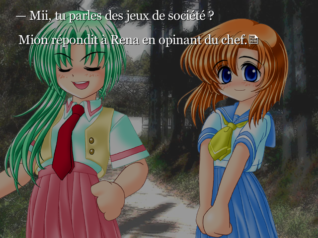 Les huit tomes qui composent le jeu sont divisés en deux grandes parties. Tout d’abord « le cycle des questions » qui vient poser les bases de l’intrigue, nous introduisant les relations entre les personnages et les coutumes du mystérieux village d’Hinamizawa, dans lequel ces derniers évoluent. Les quatre derniers tomes forment ensuite « le cycle des réponses », ayant pour objectif d’apporter la solution à tous les questionnements soulevés dans les tomes précédents. En France, nous avons eu la chance de pouvoir bénéficier d’une traduction française légale très rapidement, bien avant le reste du monde. Malheureusement face à son succès elle est à présent écoulée. Le jeu reste toutefois disponible sur la plateforme Steam, en anglais.