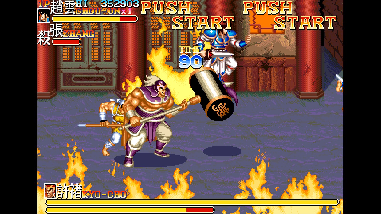 Warriors of Fate reprend cette idée abandonnée dans Knights of the Round et l’améliore en y ajoutant un petit plus. Ses héros sont capables de sauter lorsqu’ils tiennent un ennemi, pour l’envoyer valdinguer sur les autres de façon plus ou moins fracassante mais provoquant des dégâts de masse.