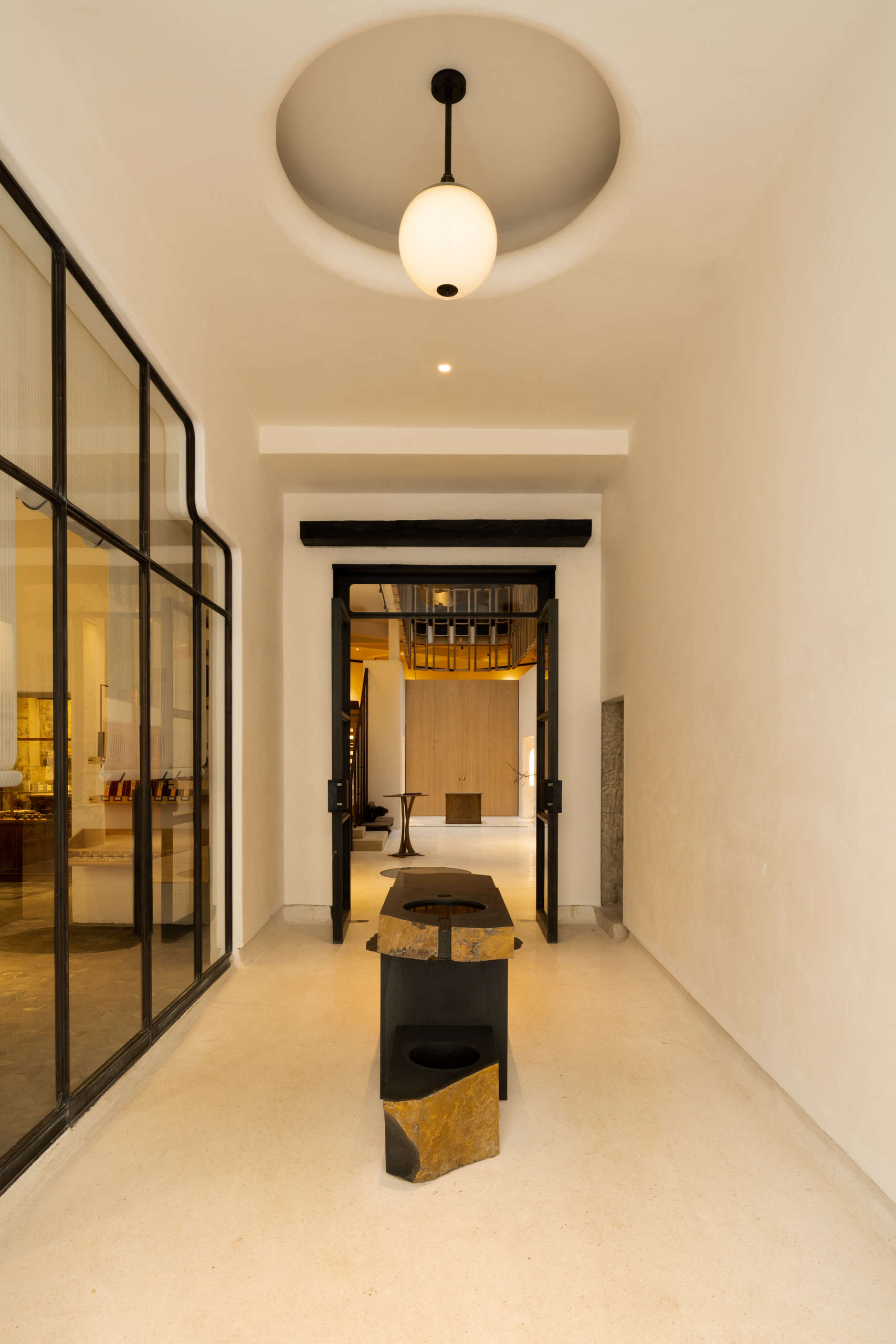 Il s’imprègne de son histoire, de son architecture, de ses musées. Il choisit la rue Debelleyme à l’abri de la frénésie du Marais, mais proche des galeries d’art. C’est ici que s’ouvre les portes d’OGATA Paris, au n°16. Il ne touche pas à l’architecture originale du lieu. Il l’imprègne de traditions ancestrales japonaises: des murs recouverts de plâtre shikkui (technique japonaise obtenue à l’aide de chaux et poussière de coquille d’œuf) au monolithe en pierre kanmuri-ishi (non polie, propre à la préfecture de Miyagi sur l’île de Honshu), en passant par les plafonds de terre cuite aux couleurs rouge et brune appelées kakishibu (procédé ancestral de teinture d’origine japonaise qui consiste à faire fermenter les extraits d’un kaki pour produire un jus rouge-brun foncé). Le lieu a l’âme du maître.