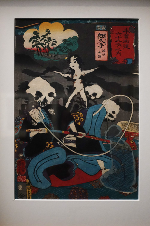 La route du Kisokaidō ne profite pas de la même réputation que celle du Tokaidō mais n’en reste pas moins l’une des Cinqs Routes d’Edo qui ont modulé le transport de marchandises et les déplacements des Japonais pendant cette ère de paix. L’exposition « Voyage sur la route du Kisokaidō – De Hiroshige à Kuniyoshi » est une véritable merveille que nous vous recommandons vivement de découvrir, tant pour les somptueux paysages de la série Soixante-neuf Relais de la route du Kisokaidō qui rendent compte de l’incroyable voyage qu’elle représentait, que pour les originales représentations de Kuniyoshi, si différentes de ce que l’on a l’habitude de voir.