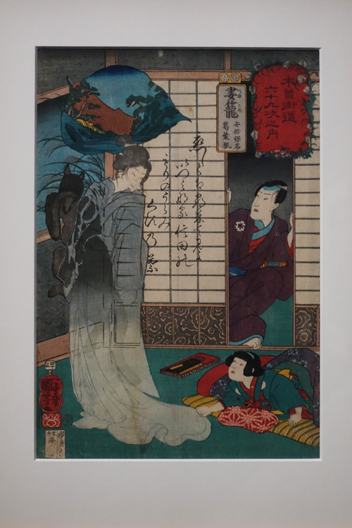 La seconde série, réalisée par Utagawa Kuniyoshi, est une collection présentée pour la première fois au public. Avec un angle de vue particulièrement original, l’artiste présente ici la route du Kisokaidō dans une ambiance à l’extrême opposée de la série d’Eisen et Hiroshige. Ici, ce ne sont pas des paysages et des voyageurs qui sont dévoilés, mais une représentation bien personnelle des stations du Kisokaidō. En réalité, il y a même très peu de rapport direct avec ces dites-stations. Kuniyoshi aborde le sujet au travers de l’humour, avec notamment des jeux de mots (difficiles à cerner pour ceux qui ne parlent pas le japonais), en s’inspirant, entre autres, du folklore japonais, du kabuki ou encore de la littérature japonaise. Les estampes réalisées offrent un résultat détonnant et très coloré. On s’intéresse ici aux expressions du visage et aux situations dépeintes où se mêlent personnages historiques, yôkai et contes populaires. Cette série, tout aussi riche que la précédente, est une mise en scène des stations du Kisokaidō. On observe dans le coin supérieur gauche de chaque estampe un encadré dans lequel figure la station correspondante. Encore une fois, et cela de manière générale dans l’art, les préférences personnelles orientent le regard. Ici, c’est tout particulièrement l’estampe du relais 40, Suhara : Narihira et Dame Nijō, qui est apprécié pour l’histoire qu’elle partage, et celle du relais 49, Hosokute : Le Seigneur Horikoshi, pour son côté lugubre.