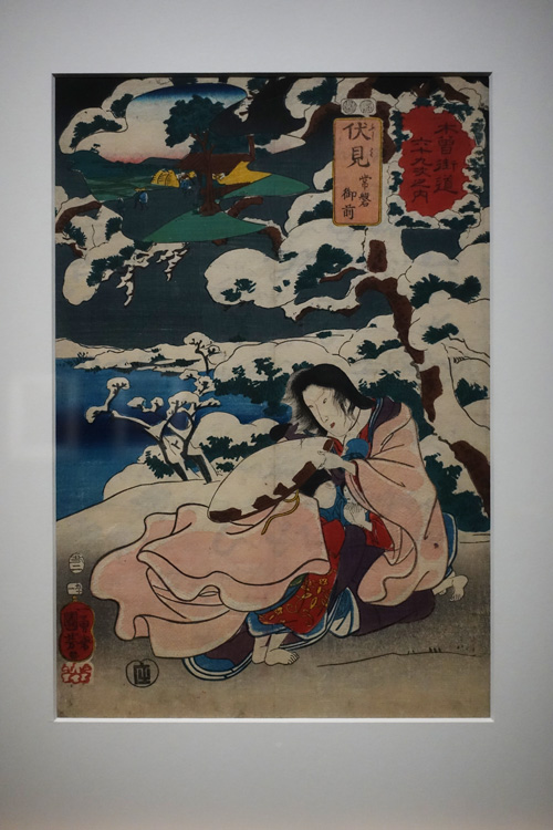 La première, Soixante-neuf Relais de la route du Kisokaidō, a d’abord été initié par Keisai Eisen avant d’être achevée par Hiroshige. « Considérée comme l’une des plus belles au monde pour la qualité du tirage et la fraîcheur des couleurs » (cf. Cernuschi), ce sont ici des scènes de vie et des paysages arpentés qui sont représentés. Les différentes stations du Kisokaidō prennent vie dans de somptueux décors que les couleurs rendent si caractéristiques. D’un point de vue très personnel, ce sont principalement les paysages enneigés d’Utagawa Hiroshige qui marquent, tout comme lors de l’exposition Fuji, pays de neige. Ici, nous pouvons citer l’estampe du relais 29, Wada, et celle du relais 47, Oi, comme particulièrement poétiques. Néanmoins, ne citer que quelques estampes parmi toute cette série est un exercice bien fastidieux : elles ont toutes un petit quelque chose qui fait que même la moins attrayante reste admirable !