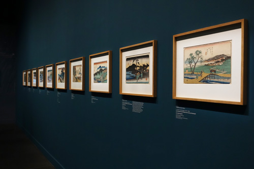 L’exposition s’ouvre sur une petite pièce sombre dans laquelle est diffusée une vidéo présentant 9 des principales stations du Kisokaidō avec l’estampe d’Hiroshige correspondante à la dite-station, une photo d’époque puis une photo récente prise entre 2014 et 2020. Cette présentation est particulièrement intéressante : entre la représentation artistique, la réalité d’autrefois et celle d’aujourd’hui, les différents visages que prennent ces stations offrent un large panorama des possibilités. C’est ensuite dans deux petites pièces et une immense que sont présentées les estampes de Utagawa Hiroshige et Utagawa Kuniyoshi, accompagnées d’objets d’époques utilisés pendant ce long périple. Sur un fond bleu obscure, le voyage commence…