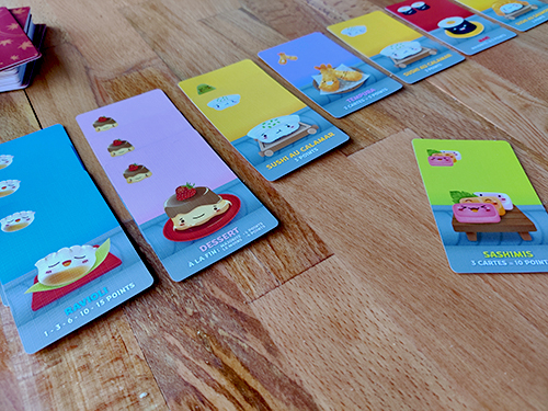 Le principe de Sushi Go est simple : en trois manches, il s’agit d’accumuler le maximum de points pour remporter la partie. Pour cela, il faut être fin stratège et bien avoir en tête les scores apportés par chaque carte. Il existe 8 types de cartes. Certaines ne rapportent des points qu’en étant combinées : les tempura fonctionnent par paires et les sashimis par trio. Quant aux raviolis (gyoza), plus on en possède, plus les points augmentent de façon exponentielle. On retrouve également 3 sushis différents (omelette, saumon et calamar) qui rapportent plus ou moins de points. Ils peuvent être combinés à des cartes wasabi pour voir leur score triplé. Enfin, les cartes maki rapportent un nombre fixe de point au joueur en possédant le plus, puis au second. Les cartes desserts reposent sur le même principe mais le comptage de points est différent : 6 points pour le joueur qui en a le plus, -6 points pour celui qui en a le moins. De plus, c’est la seule carte qui peut être conservée depuis la 1ère manche. Il faut donc bien réfléchir aux cartes posées. Il existe une carte bonus, les baguettes, qui une fois jouées, permettent de poser une carte supplémentaire au tour suivant.