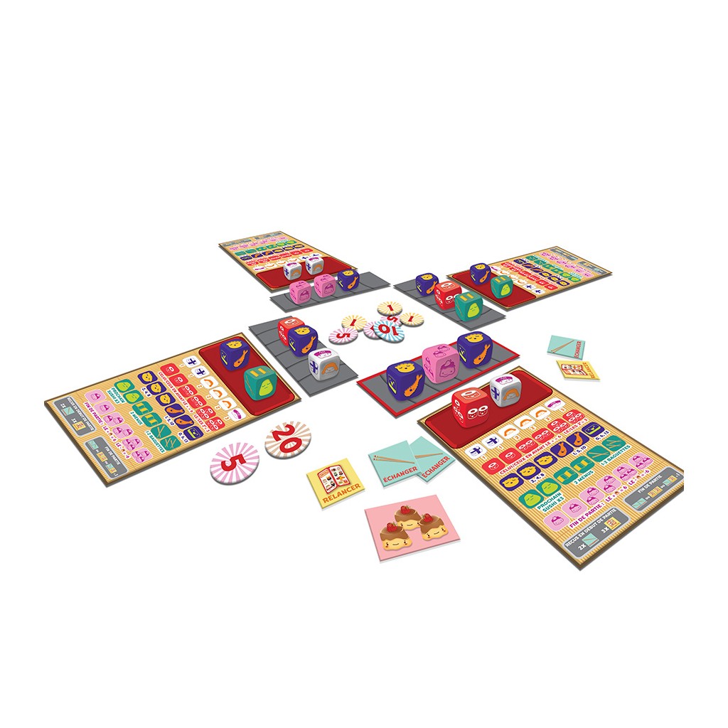Le but est de marquer le plus de points possible en récupérant les bons dés à chaque tour, ceux qui correspondent à votre « assiette », tout en surveillant les plateaux de vos adversaires et ainsi les empêcher de récupérer ce qui pourrait potentiellement les intéresser. Vous serez également aidé de bonus : deux jetons « baguettes » et trois jetons « menus ». Les premiers vous permettront d’échanger un dé de votre tapis roulant contre celui du tapis d’un autre joueur. Les seconds vous donneront la possibilité de relancer une fois le nombre de dés que vous souhaitez. Ces bonus sont également récupérables à l’aide de dés quand vous êtes à court.