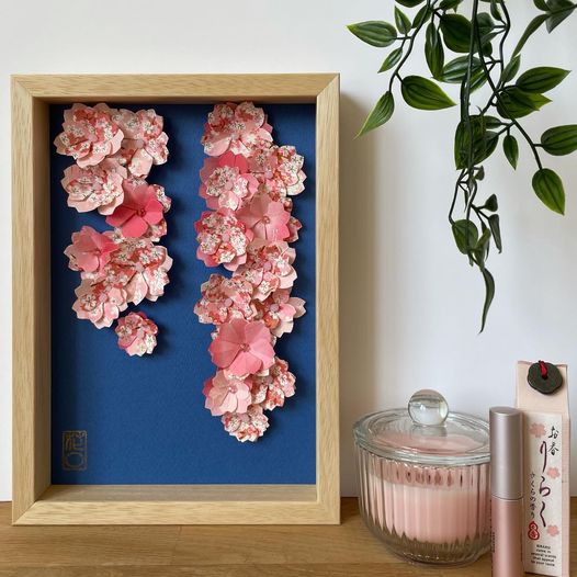 Différentes créations rencontrent de beaux succès comme des cadres avec des champs de fleurs dans des camaïeux harmonieux, des guirlandes de pampilles qui forment des spirales envoûtantes, des cartes ou cadres kimono et même des accessoires pour les cheveux, barrettes et serre-têtes.