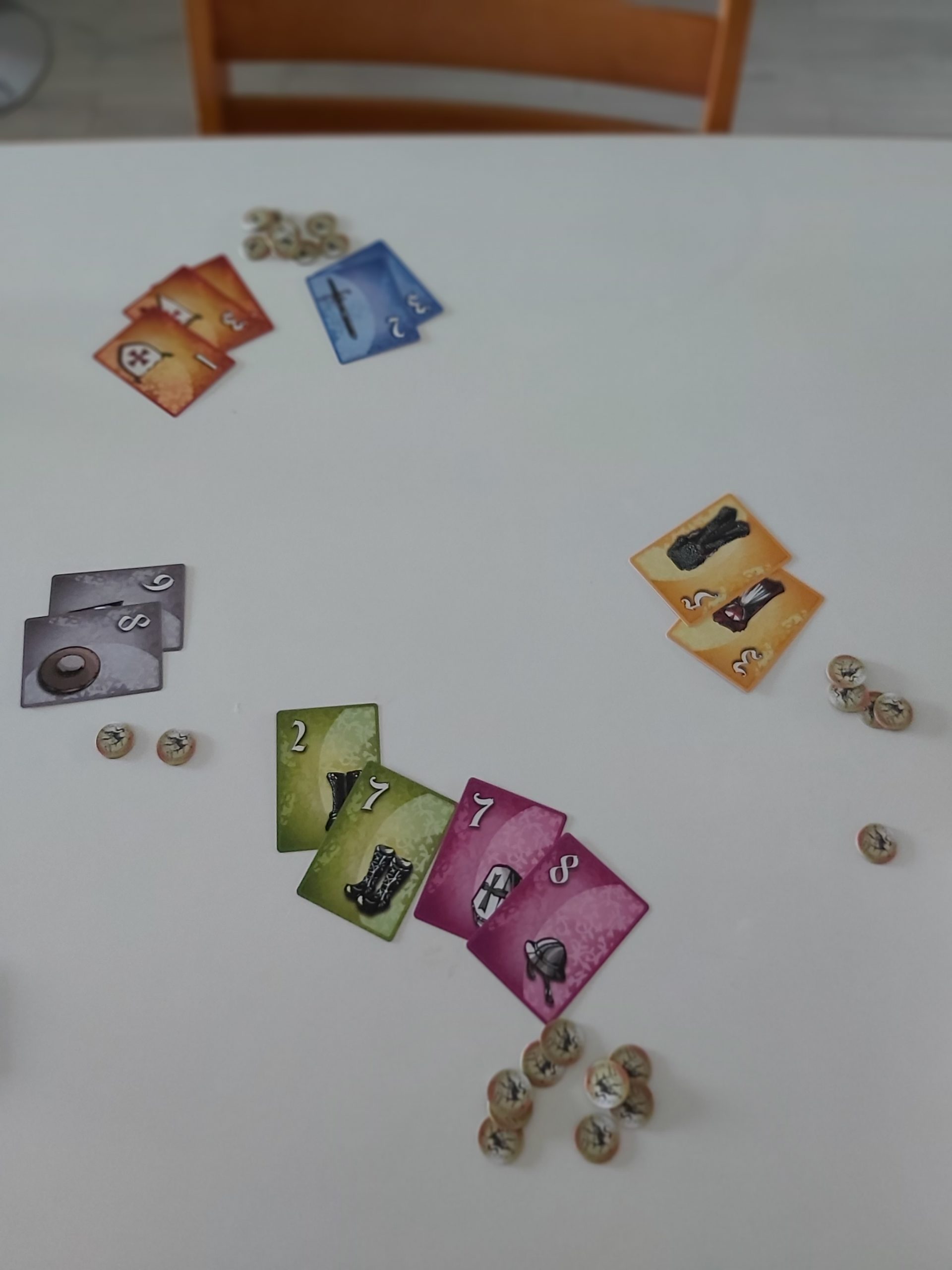 J’ai trouvé la règle des malédictions assez amusante, ainsi que la variante avec les échanges qui ajoute du piment au jeu (sauf pour ceux qui subissent les échanges forcés, bien évidemment !). Les visuels de Templari sont beaux : je trouve que le fait qu’il y ait une couleur selon le type d’objet (les boucliers, les tenues, les armes…) est bien trouvé. Et je dirais que ce jeu peut être bien pour apprendre aux enfants à compter.