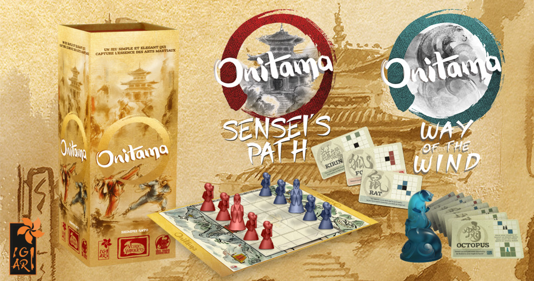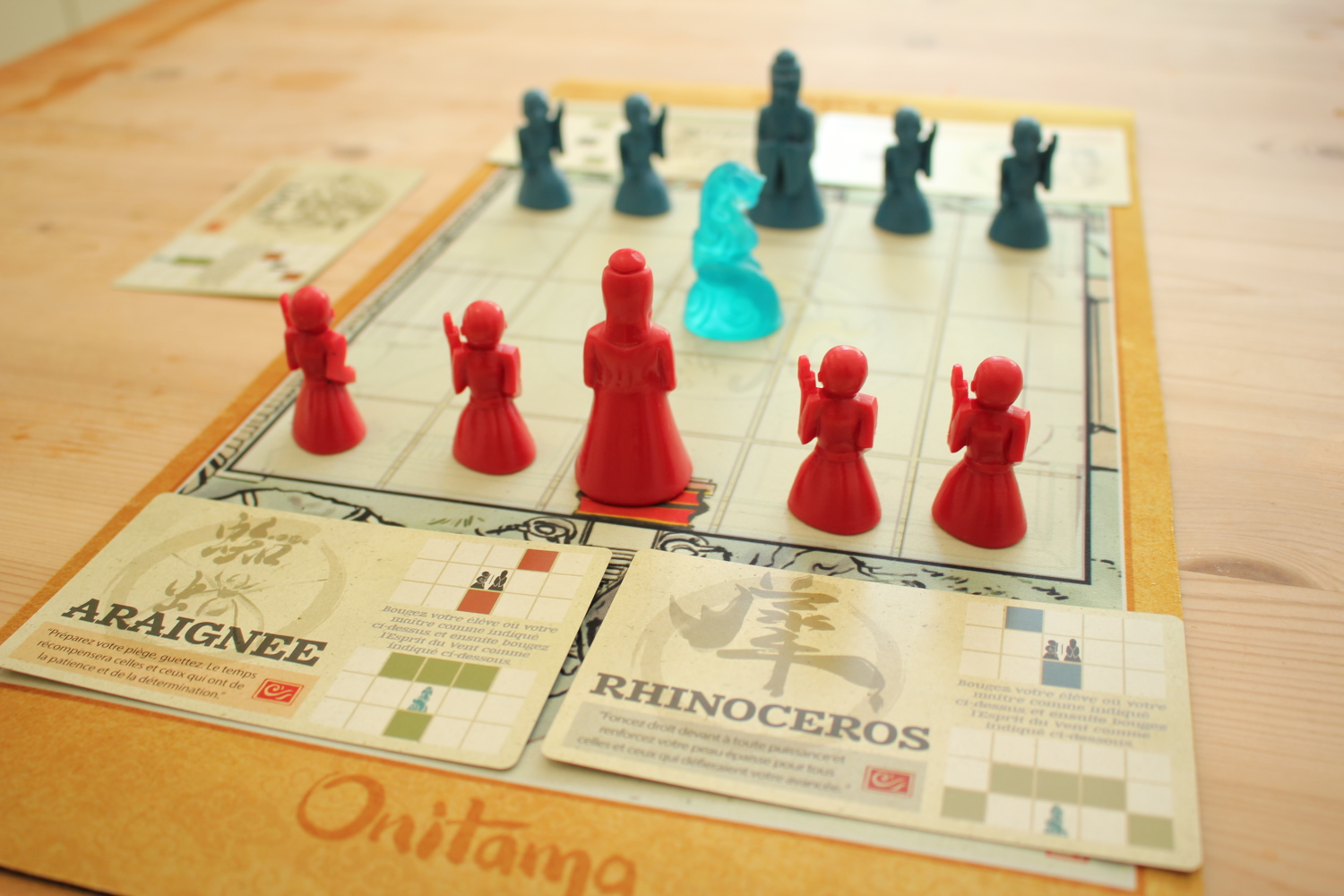 Onitama est un jeu de Shimpei Sato, illustré par Nagahara Chiyo, Mariusz Szmerdt, Lucy Liu et Sayuri Romei, sous la direction artistique de Jun Kondo. Il se présente comme une sorte de jeu d’échecs, sur un plateau de 5 cases par 5, et où les mouvements des pions dépendent de cartes. Chaque joueur dispose de 4 pions disciples et d’un pion maître. Tous les pions se déplacent en fonction des cartes mouvements présentent dans la main du joueur. Il existe 2 manières de gagner une partie : éliminer le maître adverse (avec un disciple ou son maître) ou poser son maître sur la case « autel » adverse qui est initialement occupée par les maîtres.