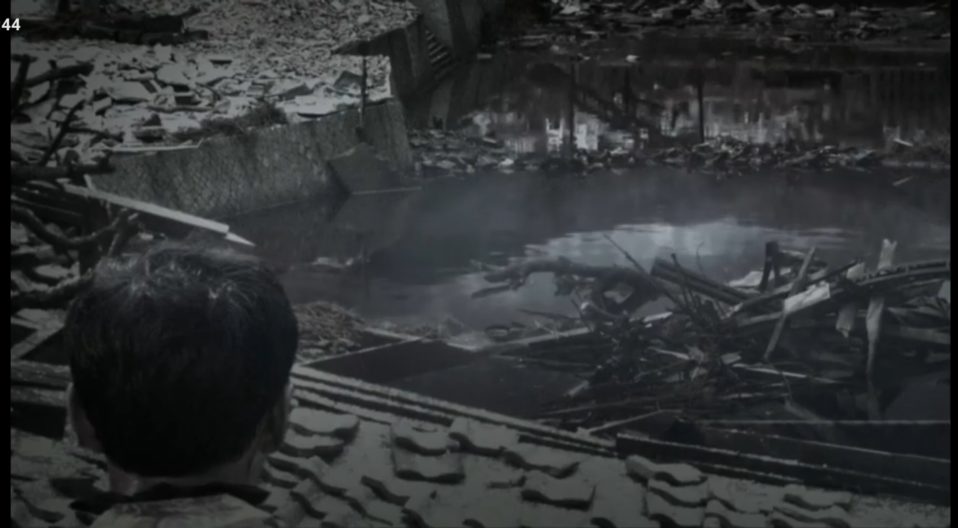 Trois jeunes garçons qui travaillent dans une usine à proximité viennent à lui. Une pluie d’acide s’abat alors sur les enfants et l’ingénieur. Un des enfants meurt après avoir bu de l’eau polluée par les radiations encore intenses. Inquiet, Tsutomu Yamaguchi part à la recherche de ses deux collègues. Il emprunte un des bateaux de la société Mitsubishi et les retrouve en vie. Devant l’horreur de la situation, Yamaguchi leur dit alors : « Il faut retourner à Nagasaki par n’importe quels moyens ».