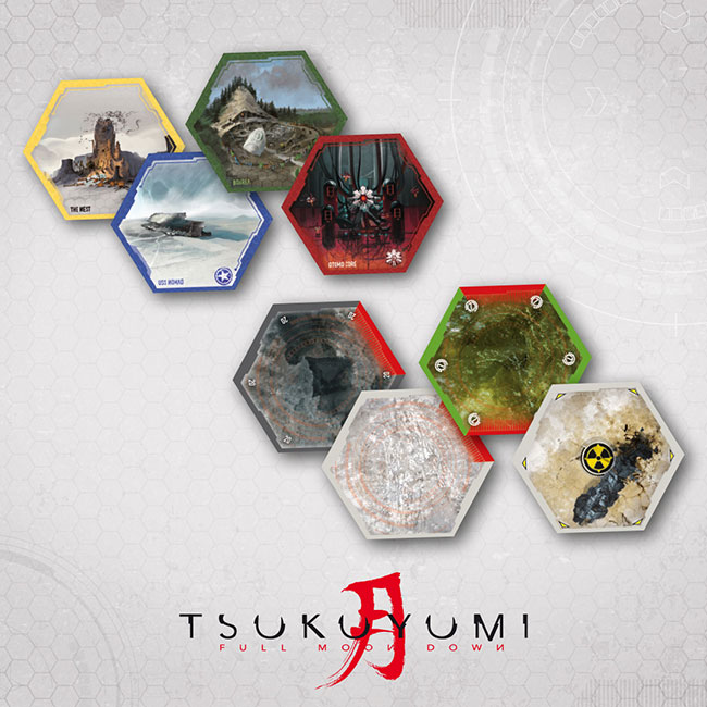 Le plateau de jeu est composé de dizaines de tuiles, pièces hexagonales que les joueurs placent à tour de rôle en début de partie. Pour les parties à 2, en plus des zones de la Lune (7 hexagones), 10 tuiles Zone sont ajoutées. Pour 3 joueurs, 21 tuiles Zone. Si les 4 factions de base sont utilisées, les joueurs doivent en placer 28 en tout. Cela peut donc prendre pas mal de place : il faut donc prévoir une table assez grande pour installer correctement les 4 joueurs. Il existe 3 types de zones : fond de l’océan, terrain fertile et montagne plus difficile à conquérir. Les zones peuvent avoir des caractéristiques comme Tsukuyumi qui permet aux Oni d’apparaître sur ou à côté de la zone. Toutes les unités présentes sur une zone radioactive à la fin de la manche sont détruites. Bon à savoir : la faction Nuée Noire ainsi que les Oni sont immunisés contre la radioactivité ! Les Zones de la Lune appartiennent à Tsukuyumi et aux Oni au début de la partie.