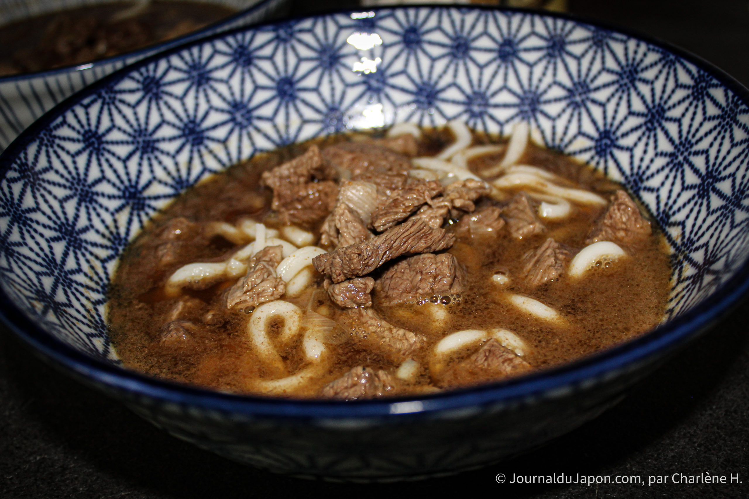 - Ajouter la soupe préparée au début de cette recette pour recouvrir les nouilles, la viande et les oignons. Pour épicer un peu le plat, vous pouvez utiliser le Hontaka Shichimi Togarashi, un condiment.