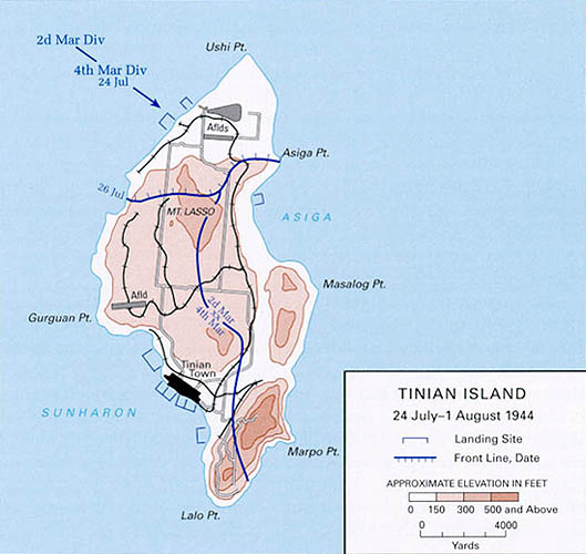 Après Saipan, le second objectif est de prendre l’île au sud, Tinian. Face aux 9 000 défenseurs, 16 000 hommes du V Amphibious Corps sont mobilisés. Le terrain facilitera les opérations pour les assaillants : en effet, l’île est relativement plate, couverte de champs de canne à sucre, avec seulement quelques hauteurs. Le débarquement a lieu le 24 juillet. Une attaque de diversion près de Tinian Town, au sud de l’île, permet de diviser en deux groupes les forces japonaises durant les premières heures de l’attaque. Grâce aux faibles reliefs de l’île, Tinian est prise en seulement 9 jours de combat grâce à l’utilisation des tanks et de l’artillerie. Le , les Japonais tentent une charge suicide qui n’arrive pas à percer les lignes américaines. L’île est déclarée sécurisée le . 13 000 civils japonais sont internés en camp de détention sur l’île. La petite île sera en la plus grande base aérienne du monde capable d’abriter 50 000 hommes et un millier de bombardiers B-29.