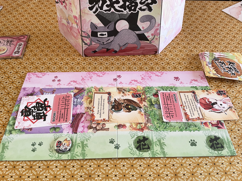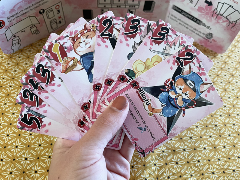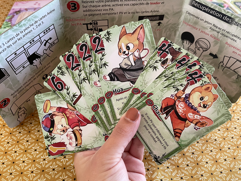 La première chose qui marque lorsqu’on découvre la boîte du jeu est son graphisme particulièrement attrayant. En l’ouvrant, on se rend vite compte que le matériel à l’intérieur est tout aussi beau. Et, il faut le dire, on aime jouer à des jeux que l’on prend aussi plaisir à admirer. Mais le graphisme et le matériel ne font pas tout et on peut vite être déçu d’un jeu lorsque l’on ne s’attarde qu’à ses apparences pour se décider ou non à l’acheter. Pour autant, ici, le jeu est tout aussi agréable que ce qu’il dégage. Kung Fur Fight apparaît rapidement comme un jeu sensiblement asymétrique puisque les deux familles, chiens et chats, ne possèdent pas du tout les mêmes techniques de combat. D’un côté, le chat ninja utilise des kunaïs qui peuvent lui permettre d’ajouter une grosse force de frappe. Et de l’autre côté, le chien shaolin mise sur des combattants plus robustes pour s’imposer en force. J’ai trouvé l’équilibre entre les deux familles très bien dosé, puisque c’est finalement les cartes additives que l’on vient se départager lors des combats qui vont faire la grande différence. Vaut-il mieux miser sur de nouveaux membres pour renforcer sa famille ? Essayer d’épuiser le plus rapidement possible les points d’énergie de son adversaire ? Ou bien tout miser sur les 4 points de victoire d’écart pour gagner ?