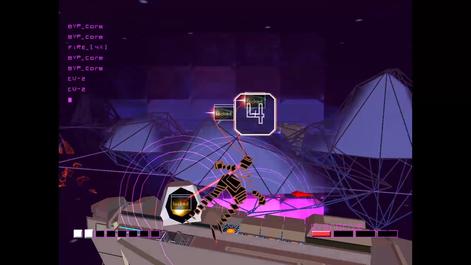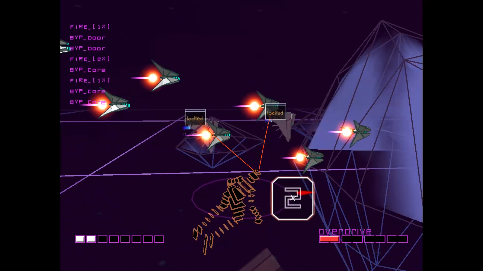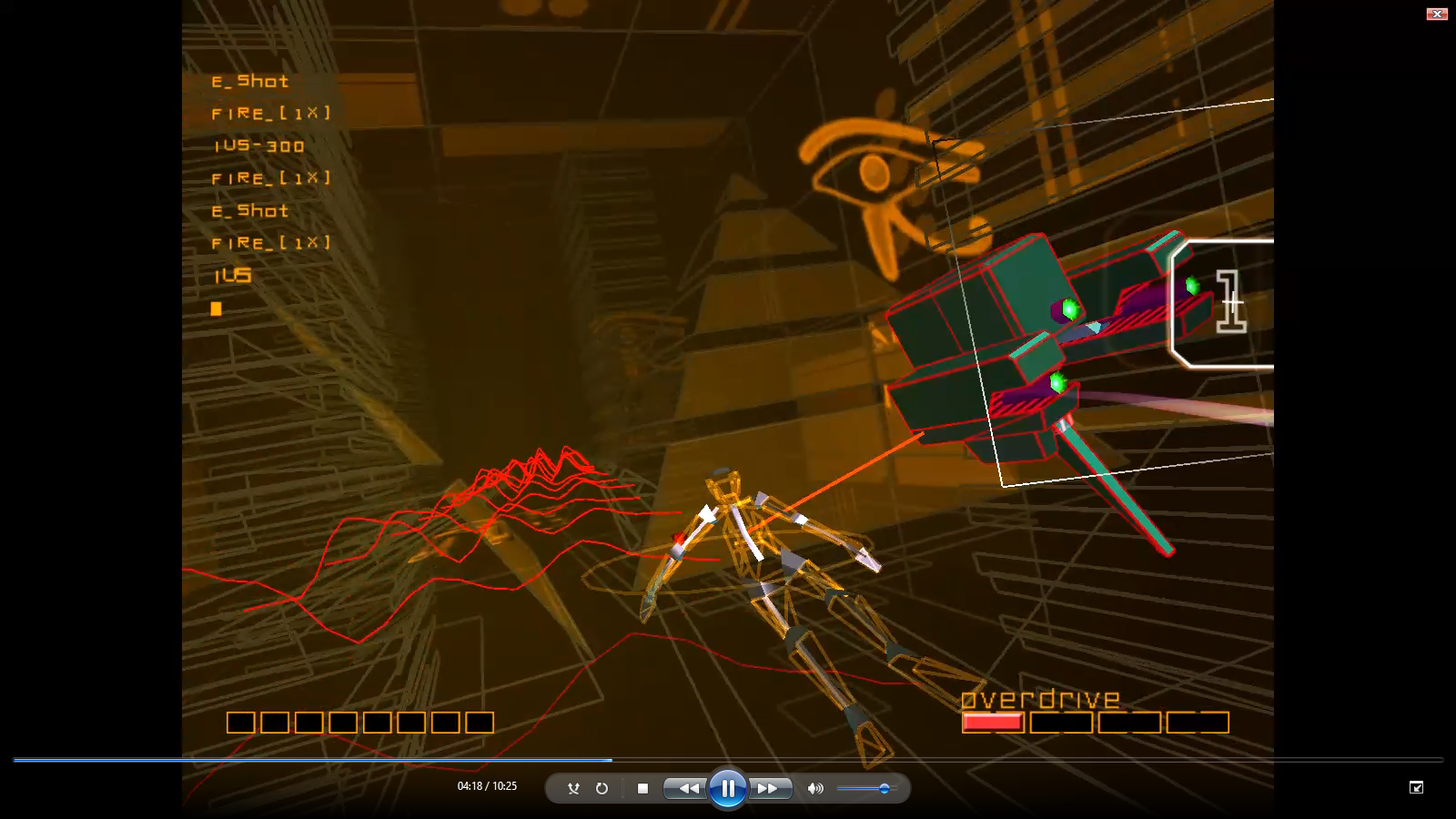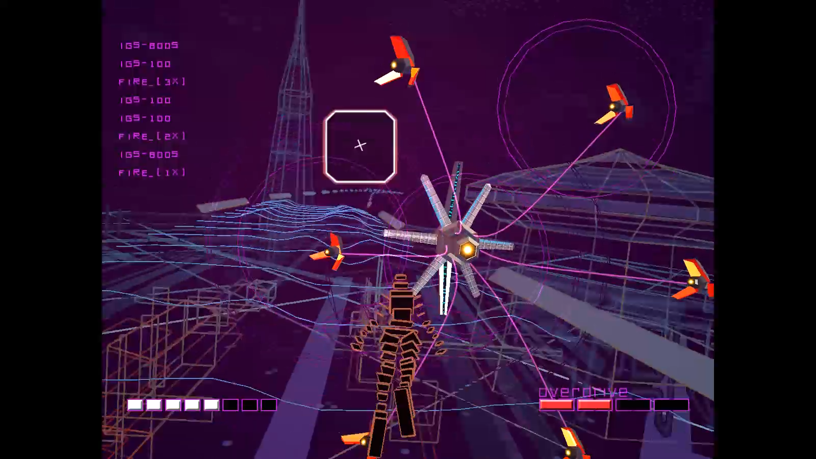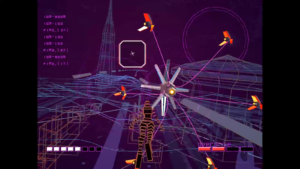Ce coté visuel est, d’autant plus, important car il ne sert pas qu’à faire joli. Rez est un jeu musical mais c’est également un rail shooter (sa perspective arrière le rend donc légèrement éloigné d’un shoot’em-up mais c’est sensiblement la même chose). La plupart des ennemis sont inoffensifs, et on peut les laisser passer sans s’en soucier, la fibre musicale se mélange à celle du scoring et si on affronte assez peu de dangers, il faut tout de même rester vigilant. L’apprentissage des niveaux est nécessaire et les boss peuvent être un vrai mur qui fait retomber l’adrénaline avec brutalité : on est fragile, et on ne sait pas toujours où se trouvent les points sensibles à viser, surtout lorsqu’il faut en plus s’occuper d’annuler les tirs ennemis au vol. On passe donc souvent son temps à bouger le curseur dans tous les sens pour attraper une cible au hasard jusqu’à bien comprendre ce qui est vulnérable.