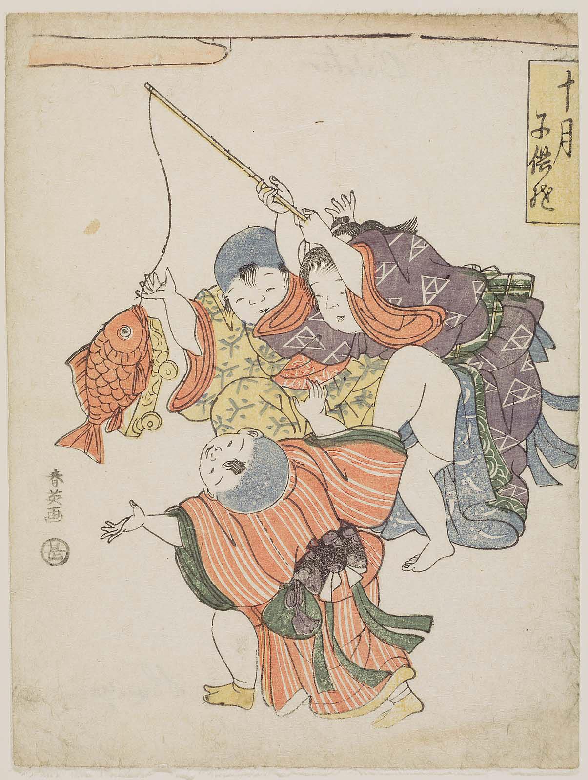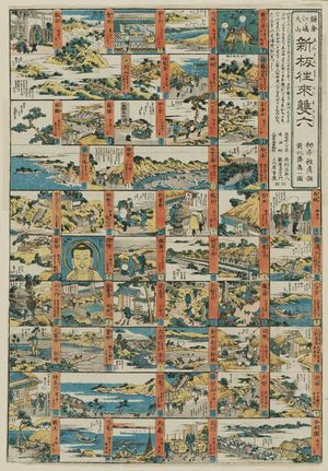 Toutefois, les estampes ne se contentent pas de représenter les divertissements, elles servent de distraction elles-mêmes. Un grand nombre d’estampes ludiques voient ainsi le jour. Les tirages destinés aux enfants présentent une grande richesse de types différents. On trouve des rébus, des représentations d’ombres chinoises à reproduire et beaucoup de planches à découper ou plier pour confectionner des maquettes, des poupées ou des jeux de cartes. Le sugoroku, sorte de jeu de l’oie, fait son apparition sur les gravures. Ses cases constituent l’occasion d’illustrations variées, souvent à visée pédagogique. Apparu dès le 12e siècle pour servir de support aux enseignements donnés dans les temples bouddhistes, ce jeu se popularise à l’époque Edo, aussi bien auprès des enfants que des adultes, grâce aux estampes qui le diffusent rapidement et à peu de frais. De par leur utilisation courante, ces œuvres ludiques ont, là encore, en grande partie disparu.