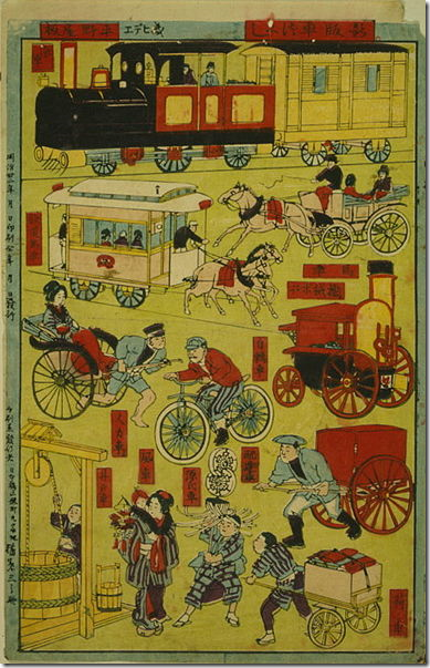 L’enseignement de l’ère Meiji, plus normalisé et ouvert sur les matières occidentales, continue d’utiliser ce procédé. Les artistes d’alors réalisent des planches à visée encyclopédique portant sur la vie quotidienne, la faune, la flore et, surtout, sur les nombreuses innovations qui bouleversent la société japonaise, offrant ainsi un précieux témoignage de la modernisation en marche.
