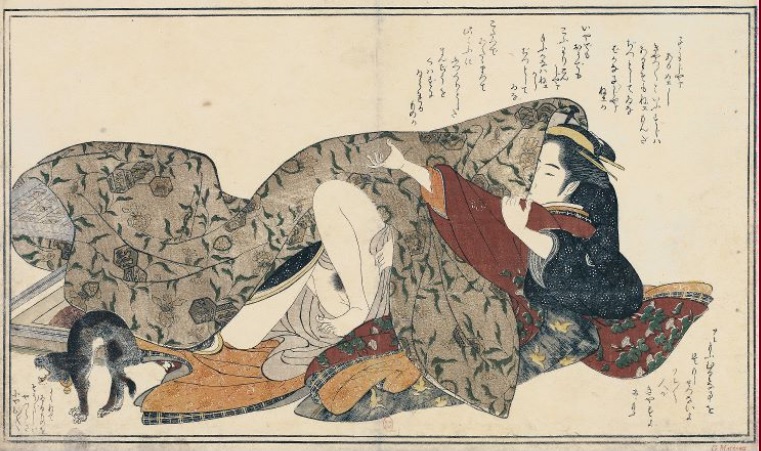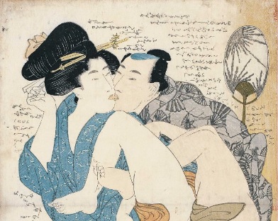 On ignore l’origine exacte des estampes érotiques : support d’éducation sexuelle pour les jeunes mariées ou simples images destinées au divertissement ? Quoi qu’il en soit, les shunga (images de printemps) apparaissent dans le paysage artistique dès les débuts de l’ukiyo-e. Par leur finesse et la variation de leurs compositions, elles relèvent d’une grande qualité artistique. Elles constituent une part importante de l’ensemble des estampes produites pendant l’époque Edo. Les plus grands peintres de l’époque, tel Hokusai ou Utamaro, en ont tous réalisé.