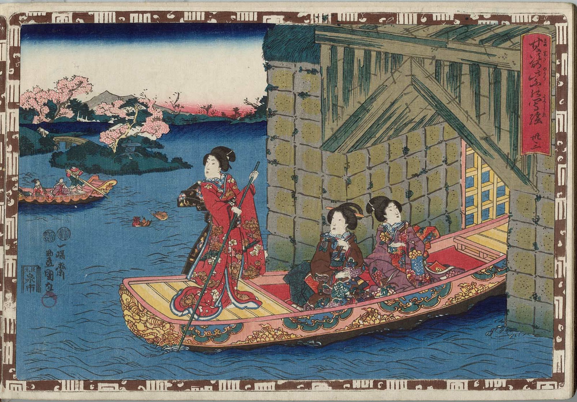 L’un des tous premiers thèmes traités par les peintres est celui des courtisanes. La croissance d’Edo concentre une importante population masculine dans la capitale shogunale : samouraïs, artisans, travailleurs journaliers… Pendant longtemps, Edo compte plus d’hommes que de femmes, phénomène qui attire nombre de prostituées. Yoshiwara, le quartier des plaisirs d’Edo, ouvre ses portes en 1617. Ses courtisanes deviennent l’un des sujets favoris des estampes, donnant naissance au bijin-ga, genre de l’ukiyo-e consacré aux beautés féminines. Les gravures constituent une publicité efficace pour les maisons closes par leur façon de magnifier les prostituées. Les artistes illustrent les guides du Yoshiwara présentant les différents établissements et leurs pensionnaires, et réalisent de nombreux portraits de courtisanes, identifiées par leur nom. Ils concourent ainsi à asseoir leur célébrité. À partir de 1793, un édit tente de limiter la portée de ces œuvres, jugées contraire aux bonnes mœurs, en interdisant de mentionner l’identité des femmes portraiturées. Le genre est toutefois trop bien ancré pour s’effacer aussi facilement.