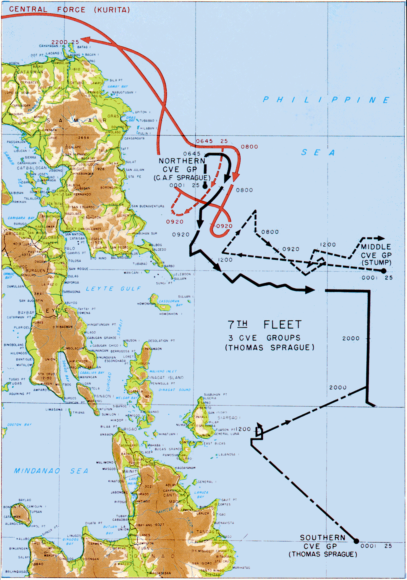 Après son repli dans la mer de Sibuyan, le vice-amiral Kurita se dirige vers l’est et fait l’heureuse découverte du détroit de San Bernardino libre, sans aucune surveillance américaine. Il franchit le détroit en pleine nuit et longe la côte orientale de l’île de Samar pour se rendre au golfe de Leyte. Au lever du soleil, des navires américains sont signalés par les vigies. Ils pensent avoir en face d’eux les porte-avions de l’amiral Halsey (qui est loin au nord occupé avec la flotte d’Ozawa). Il s’agit en fait d’une partie des porte-avions de l’escorte du vice-amiral Kinkaid, la flottille du contre-amiral Clifton Sprague qui est l’unique écran devant le golfe de Leyte. Les deux autres unités d’escorte de la 7e flotte des amiraux Stump et Thomas Sprague sont plus au sud et sud-est. Les porte-avions d’escorte avaient été conçus pour la lutte anti-sous marine et ne se déplacent qu’à seulement 18 nœuds : des proies faciles qui ne sont pas du tout de taille pour affronter les plus puissants cuirassés du monde ! Et, pire, ce sont les transporteurs qui alimentent la bataille terrestre et la reconquête de Leyte qui sont extrêmement menacés… Si le dernier rempart, les navires de Sprague, coulent, les Japonais auront réussi à repousser l’invasion des Philippines et le plan Shō-Go 1 aura été un succès…