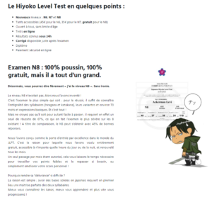 Deux facteurs ont été déterminants : le fait que le JLPT soit annulé en raison du Covid, et le constat que le niveau « basique » du JLPT (le N5) était déjà assez costaud à obtenir, et qu’il n’existait aucun véritable palier pour encourager mes élèves et leur permettre de savoir réellement où ils en sont. C’est pour cela qu’en plus des 5 niveaux officiels du JLPT, j’ai rajouté 3 niveaux non-officiels : N6, N7 et N8. Ces trois nouveaux tests portent le nom de « Hiyoko Level Test » pour les identifier comme des entités bien à part du JLPT. C’est un peu « le JLPT pour les élèves poussins ». Il faut préciser que la Fondation du Japon (qui a créé le JLPT) n’est ni liée ni concernée par le contenu de nos examens, même si elle a accueilli notre initiative avec bienveillance.