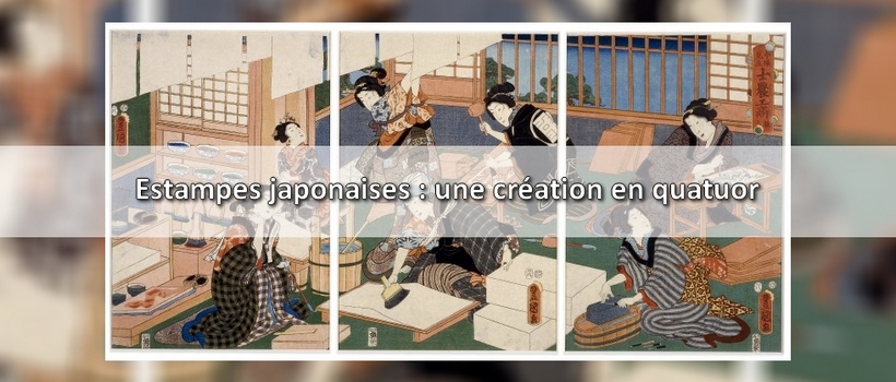 Dans les deux précédents articles sur l’estampe japonaise, nous avons évoqué les grands peintres qui ont popularisé ce genre. Hokusai, Hiroshige, Utamaro, Kuniyoshi…sont autant de personnalités bien connues, que l’on associe automatiquement à l’art de l’ukiyo-e. Leurs noms se confondent avec l’histoire des gravures. On en oublie parfois que la réalisation d’une estampe n’est pas le fait d’un seul homme, mais le résultat d’un travail d’équipe impliquant l’artiste (eshi), le graveur (horishi), l’imprimeur (surishi) et l’éditeur (hanmoto).