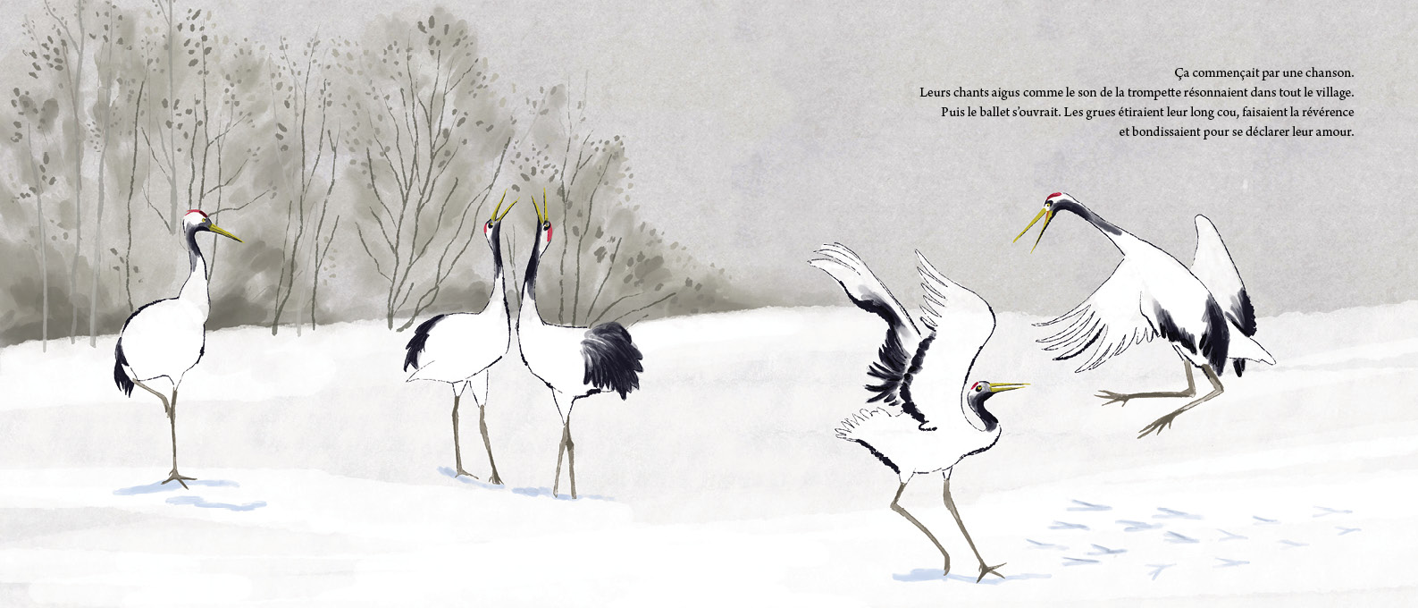 Les illustrations sont d’une très grande beauté. Dans cet univers blanc, les taches noires et rouges des grues, leurs lignes majestueuses se dessinent comme sur des estampes. Leurs mouvements aériens sont dessinés avec finesse et on pourrait presque les sentir bouger !