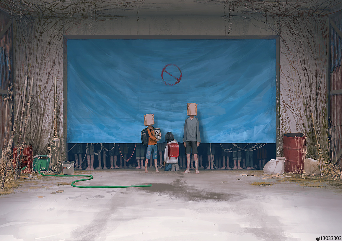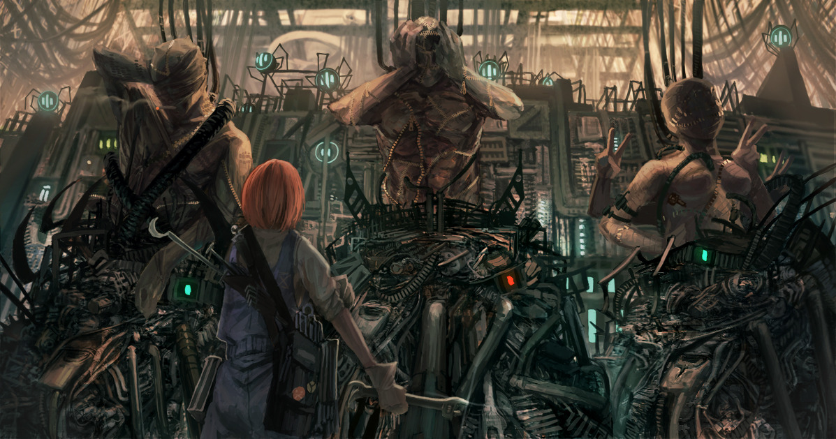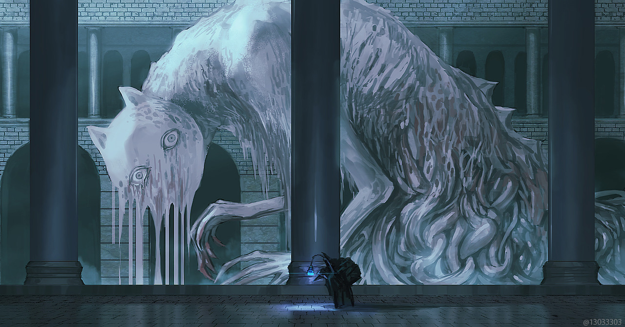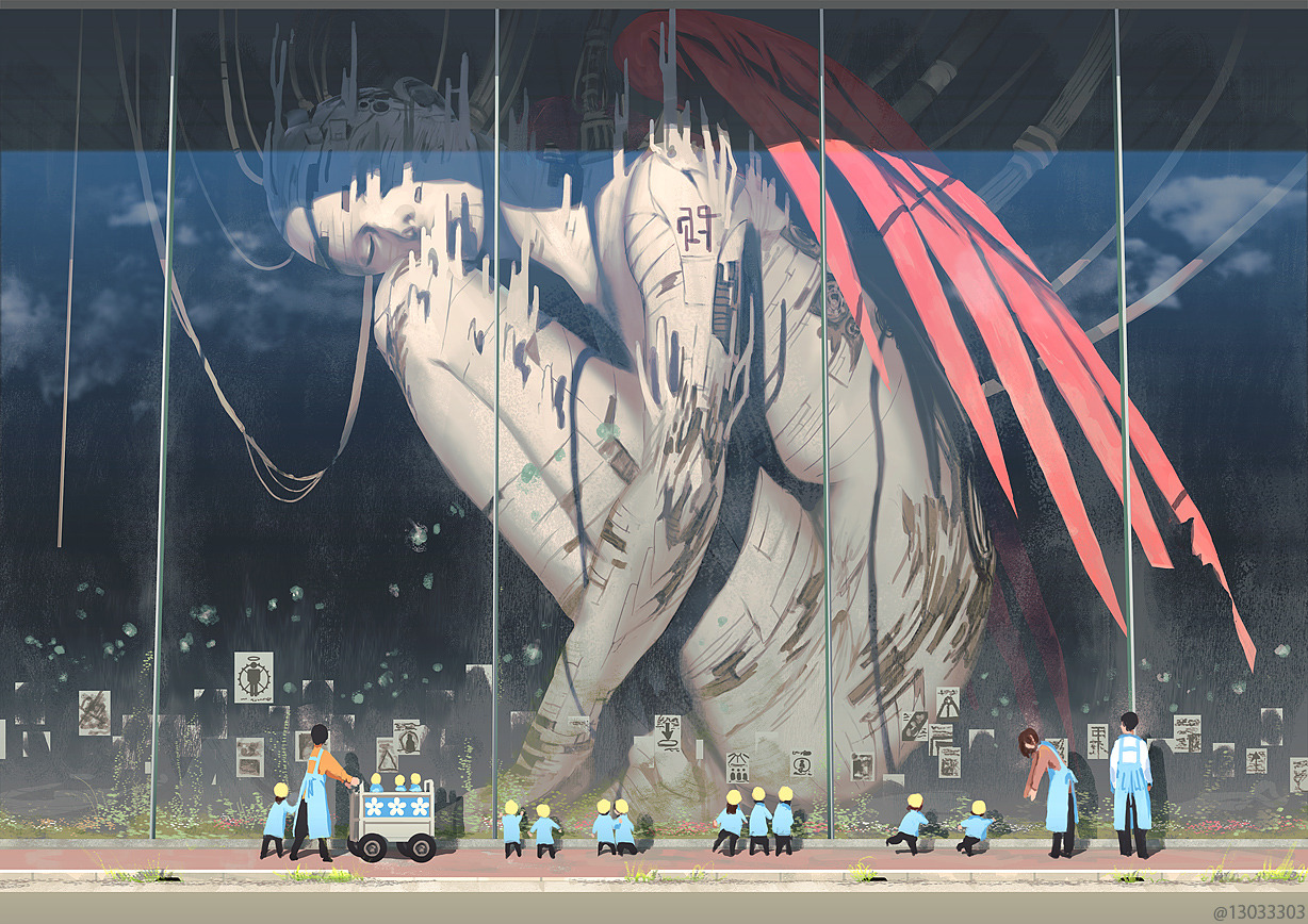 Monokubo est un artiste dont on sait peu de choses sur sa vie et son identité. Si ses œuvres ont réussi à se faire une place et que nombre d’entre nous en ont déjà croisé sur les réseaux sociaux, l’artiste qui se cache derrière est si discret qu’on ne connait ni son sexe, ni son âge, ni sa situation. Bien que son compte Instagram indique Tokyo en localisation, on peut douter de cette information. Pour en savoir plus, il faut se rendre sur son Tumblr. Les archives nous montrent des publications débutant en juin 2015. On se rend compte qu’à ses débuts l’artiste s’orientait sur un style mélangeant architecture, dystopie et fantastique, le tout dans une ambiance assez sombre. On remarque d’ores et déjà un attrait pour les créatures gigantesques puisque certaines d’entre elles sont déjà présentes dans ses premières œuvres, mais elles ne sont pas au cœur de ses peintures qui proposent plutôt une histoire où l’on suit différents personnages lors de leurs périples.