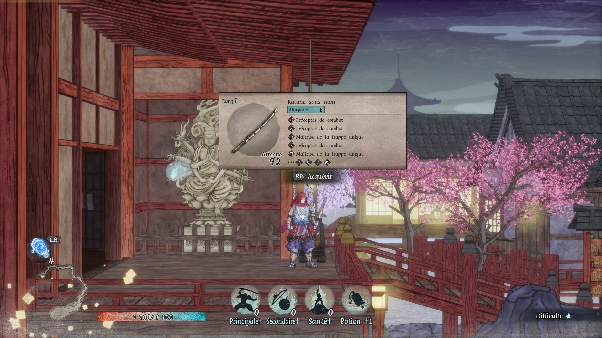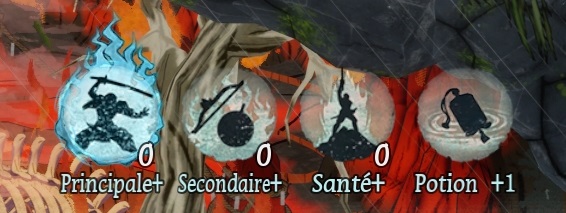 En combattant des ennemis puissants qui brillent en rouge, des boss ou en ouvrant des coffres, on récupère des âmes qui permettent de renforcer une statistique de notre personnage. Elles ne valent que pour chaque partie en cours et le protagoniste est réinitialisé après chaque mort. On ne peut pas vraiment choisir librement la caractéristique à proprement parler : il y en a quatre qui sont l’arme principale, l’arme secondaire, la santé et la potion. Elles sont rangées de gauche à droite et nécessitent un nombre d’âmes précis pour les débloquer (il faut une âme pour l’arme principale, mais quatre pour la potion). La dernière n’est par ailleurs pas véritablement une statistique puisque elle nous donne une potion, utile en cas de danger extrême.