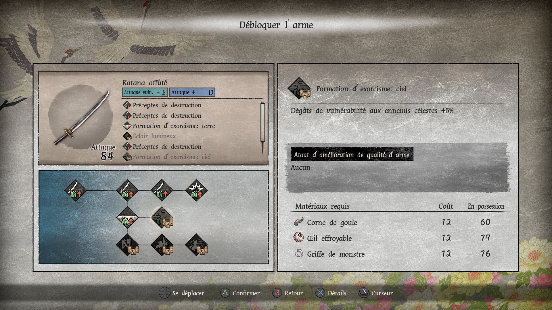 Écran de craft du Katana affûté. On peut y débloquer des attributs pour l’arme. © GuruGuru / Konami Digital Entertainment