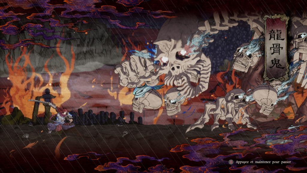 Mais les références japonaises ne se limitent pas aux décors, comme en témoigne le bestiaire qui, lui aussi, jouit d’une inspiration majeure dans le folklore japonais. Si beaucoup des monstres sont repris du jeu Famicom, ils sont remaniés pour coller à l’univers estampé d’Undying Moon. On y rencontre des oni avec des masses, des masques de nô tueurs ou encore des numagozen (des sortes de femmes serpents). Tous les ennemis sont inspirés de légendes japonaises et d’histoires de yôkai, et on a le droit a une petite description les concernant dans le bestiaire ou pendant les écrans de chargement. Il en va de même pour les boss qui rappellent d’autres mythes populaires et créatures légendaires. Ryukotsuki, qui est bien entendu calqué sur le gashadokuro, un squelette géant qui se nourrit du sang des voyageurs. Sa présentation est fortement similaire au tableau de Kuniyoshi UTAGAWA. On peut également mentionner le Renard à neuf queues, basé sur le kyûbi no kitsune, ou encore les démons Fuki et Raiki, inspirés par les dieux japonais Fûjin et Raijin. Le bestiaire, les boss en moins, ne possède que 21 créatures différentes, et on est toutefois amené à revoir fréquemment les mêmes monstres pendant une partie. Chaque ennemi est normalement censé coller au thème de son niveau, ce qui est en général le cas, par exemple avec les geishas dans le Quartier des phantasmes. Mais certains donjons, comme les Champs de neiges éternels, n’ont aucun monstre unique, aucun n’ayant le thème de la neige, du froid ou de la glace. Peut-être que d’autres créatures seront ajoutés dans le futur pour accentuer la spécificité de chaque niveau.