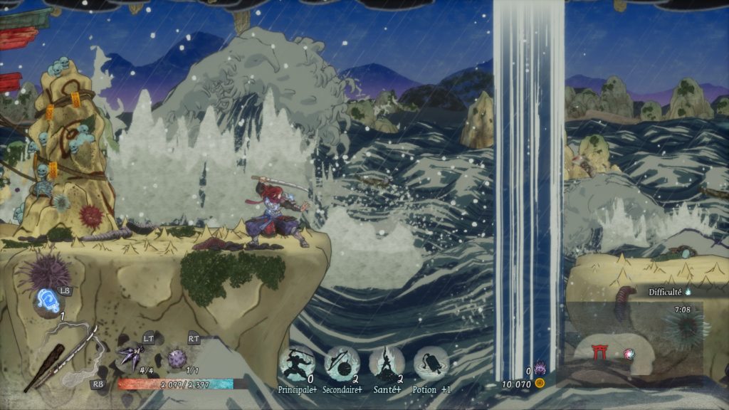 Alors que le gameplay, assez solide, se perd quelque peu dans ses petits défauts, le jeu est empreint d’une direction artistique épatante. La thématique graphique d’Undying Moon est inspirée de l’ukiyo-e et en ce sens, tous les niveaux du jeu rappellent les estampes japonaises, par ses décors et multiples effets visuels. L’un des donjons, les Grottes déchaînées, ressemble particulièrement au tableau de Hokusai, La Grande Vague de Kanagawa, qu’on reconnaît à travers le mouvement des vagues en arrière-plan. Cette inspiration artistique se retrouve aussi dans les présentations de boss, avec un écran figé et le nom de l’ennemi apparaissant à l’écran en kanji. En bref, le jeu est beau et se démarque ainsi des autres roguelikes grâce à cette direction unique. Seul bémol à relever : l’écran est souvent très chargé car il y beaucoup de choses dans le décor et énormément d’effets visuels. La lisibilité du jeu est alors un peu difficile de temps à autre, et on a parfois du mal à différencier ce qui est au premier plan de ce qui est au dernier. Un petit défaut qui pourrait être corrigé dans les prochaines mises à jour ?