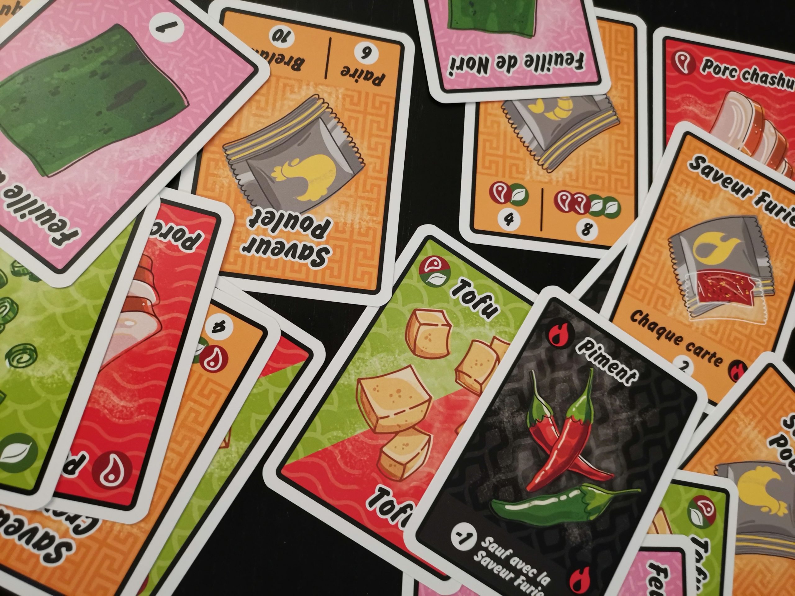 Les cartes Piment et Feuille de Nori sont soumises à des règles particulières. Lorsqu’un joueur décide de « Piocher » ou de « Réapprovisionner » et qu’un de ces deux ingrédients sort, il peut en placer un dans le bol de son choix. Un joueur ayant une de ces cartes dans sa main peut également les mettre directement dans le bol de son choix (que ça soit le sien ou non) et ce sans que cela ne compte pour une action. A la fin de la partie, chaque carte Piment fera -1 point au bol de ramen dans lequel il se trouve, à moins que ce bol ne soit assaisonné avec la Sauce Furie. La Feuille de Nori, elle, ajoute un point au total du bol dans lequel elle se trouve. La partie se termine quand un joueur a terminé de manger tous ses bols ou quand la pile d’ingrédients est vide. Tous les joueurs jouent un dernier tour une fois une de ces conditions remplies.