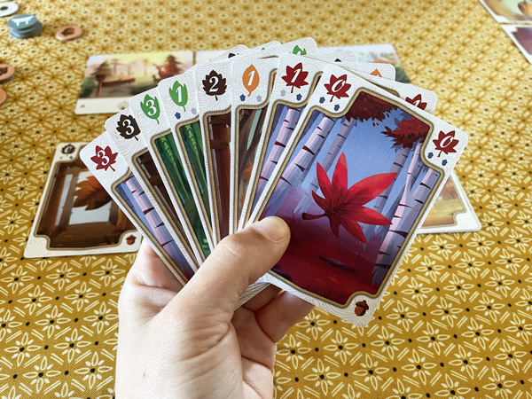 Vous commencez la partie avec 6 cartes feuilles et 3 cartes paysages. Celles-ci vous permettent d’activer des pouvoirs de manière unique durant la partie. Tour à tour, vous allez récolter des feuilles, puis les déposer face à vous. Mais attention, la pose de carte est soumise à une règle particulièrement contraignante, qui fait toute la mécanique du jeu : vous devez les poser dans l’ordre chronologique, et sans sauter de numéro ! En effet, chaque feuille est numérotée de 0 à 3, et il existe 6 familles de feuilles différentes. Vous ne pouvez réaliser qu’une pile par famille, et vous êtes obligés de les commencer par le numéro 0, puis 1, puis 2, et finir par un 3. Lorsque le 3 est posé, la pile n’est plus modifiable, vous ne pourrez plus poser de feuilles de cette famille.